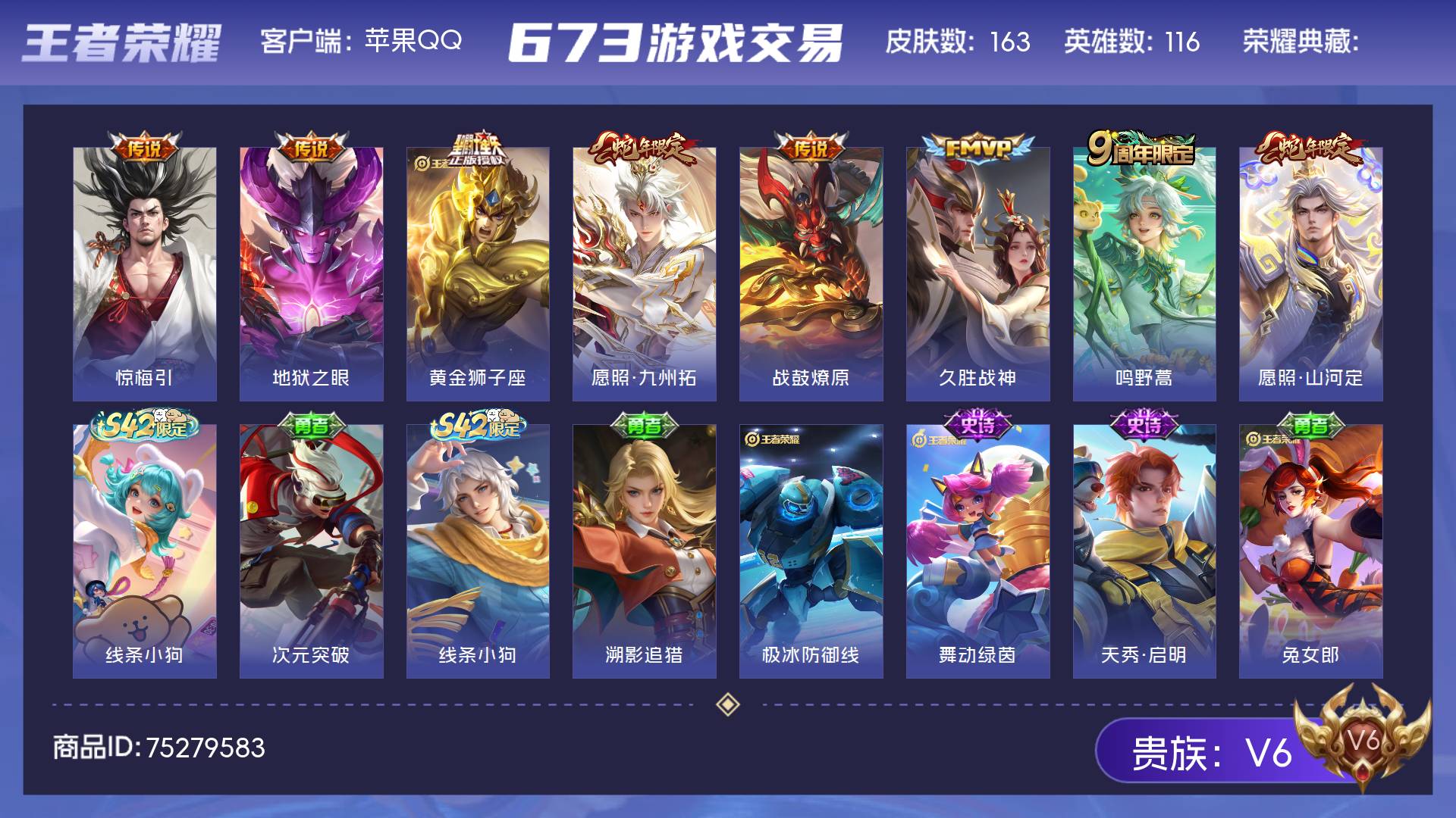 V6 皮肤163 英雄116 永恒钻石 星传说1 传说8 其他皮肤160