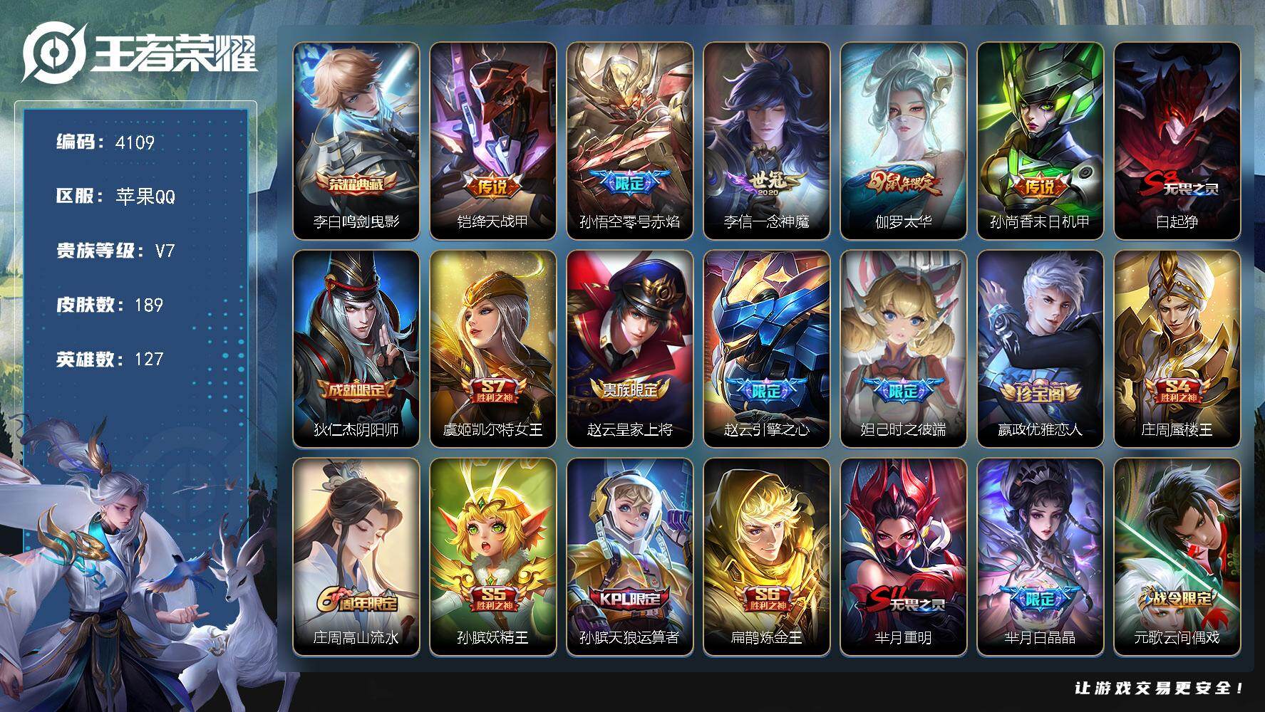苹果Q-V7-至尊星耀IV段位-127英雄-189皮肤-1典藏皮肤-5传说-5