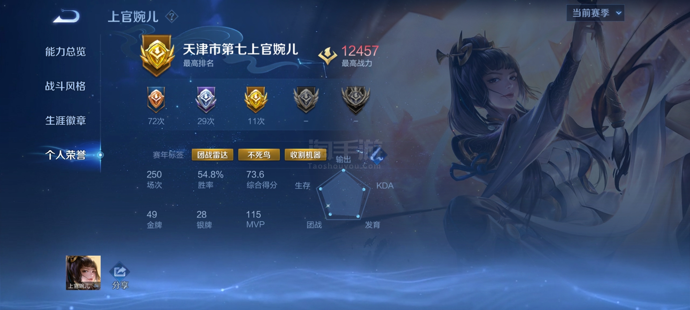 婉儿差一个皮肤全皮1万 2婉儿巅峰最高2000分现在在榜省标9000分排位63星