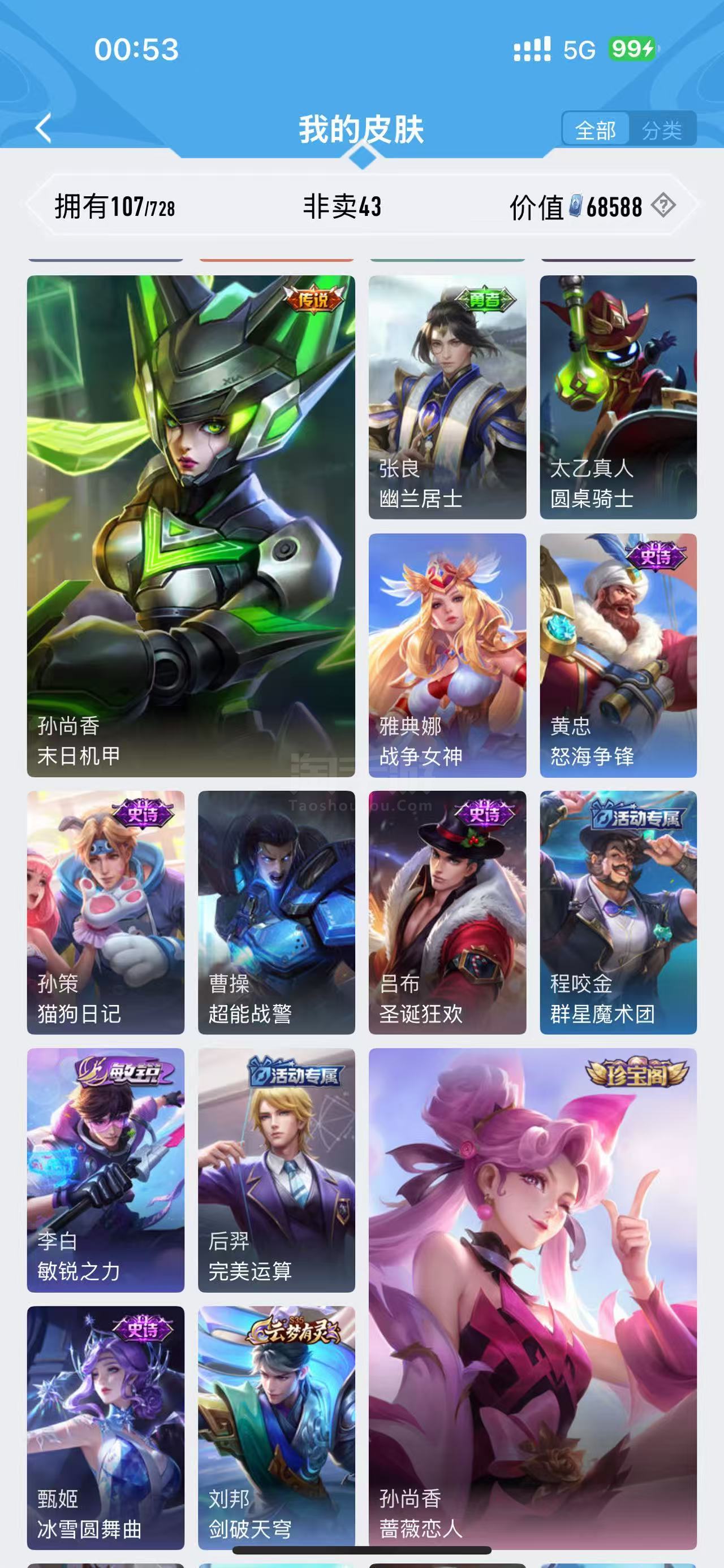 安卓QQ/至尊星耀/216皮肤/128英雄/1典藏/0珍品无双/0无双/0珍品传说/3传说/47史诗