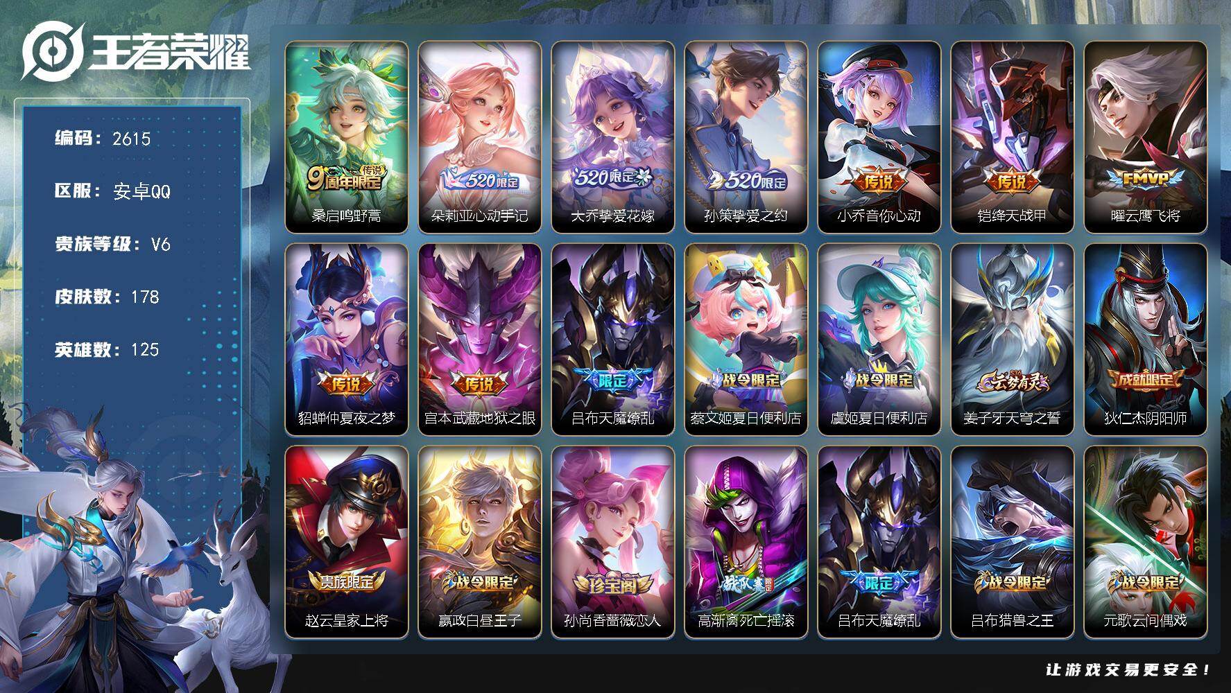王者荣耀账号,皮肤129款,英雄129个,图鉴16级,账号干净没异常,安全放心,支持打标
