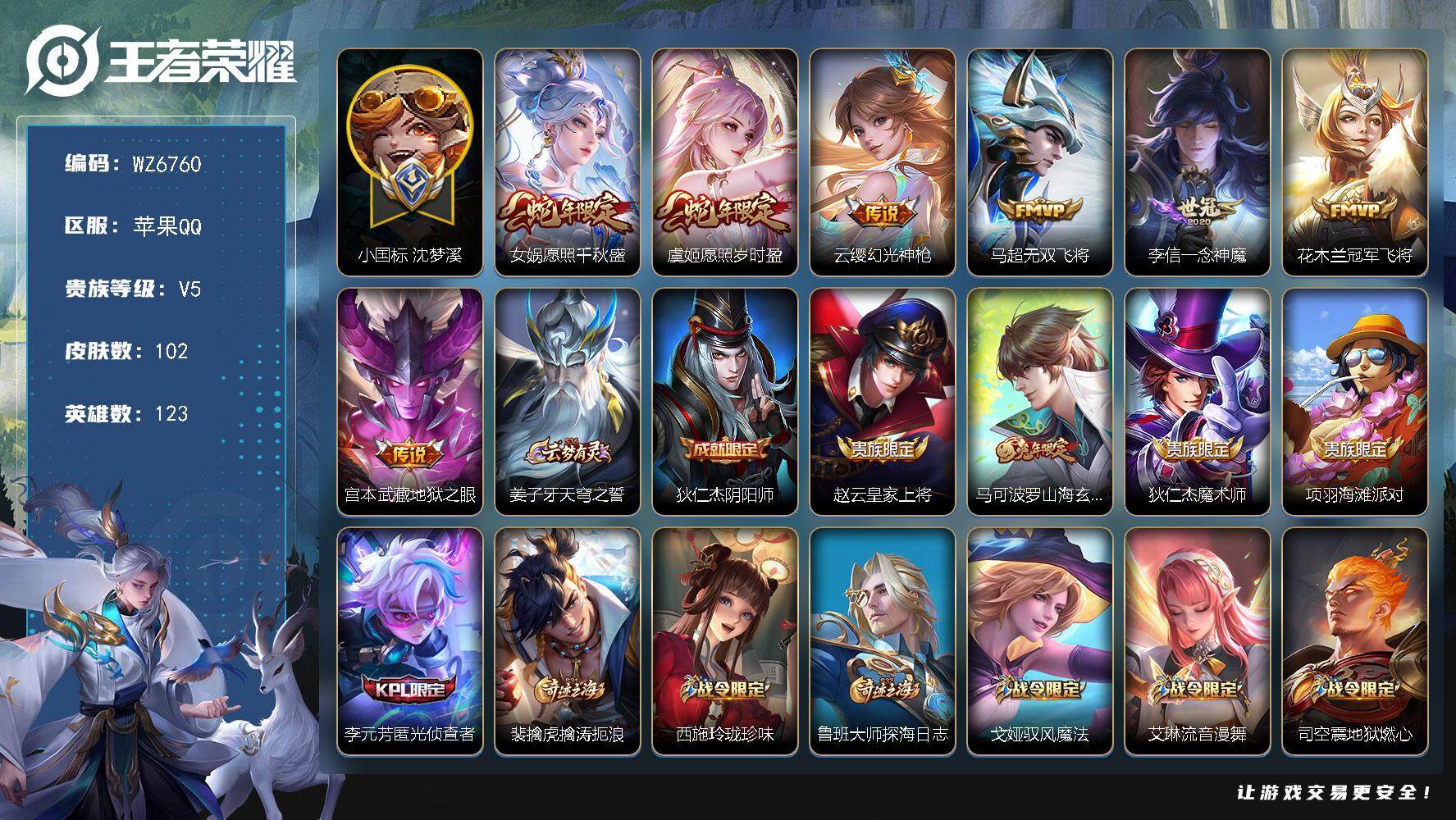 苹果Q-V5-尊贵铂金IV段位-123英雄-102皮肤-7传说-28史诗【传