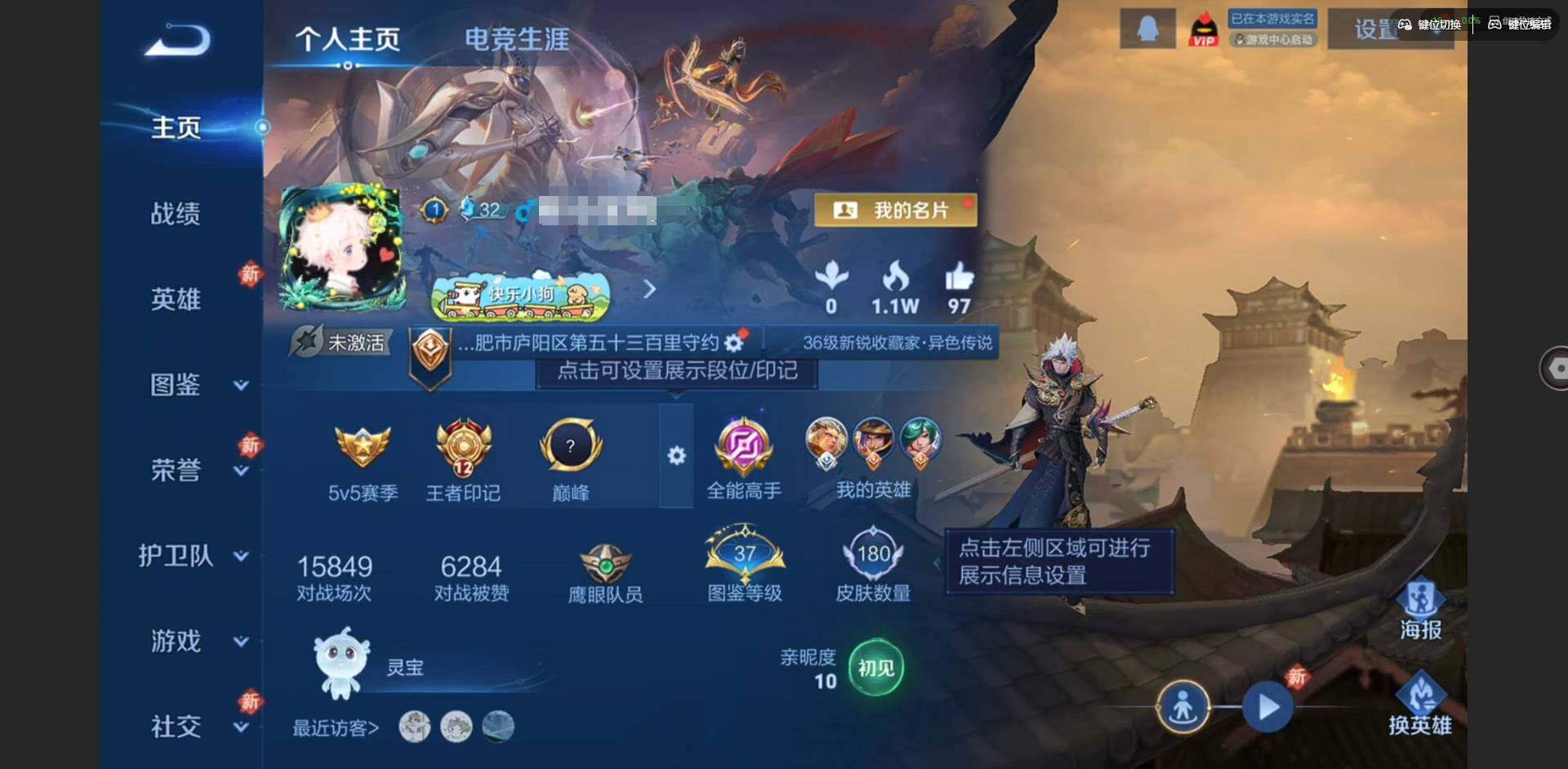 实名: 可修改 贵族等级: V7 英雄数: 127 皮肤数: 180 星传说: