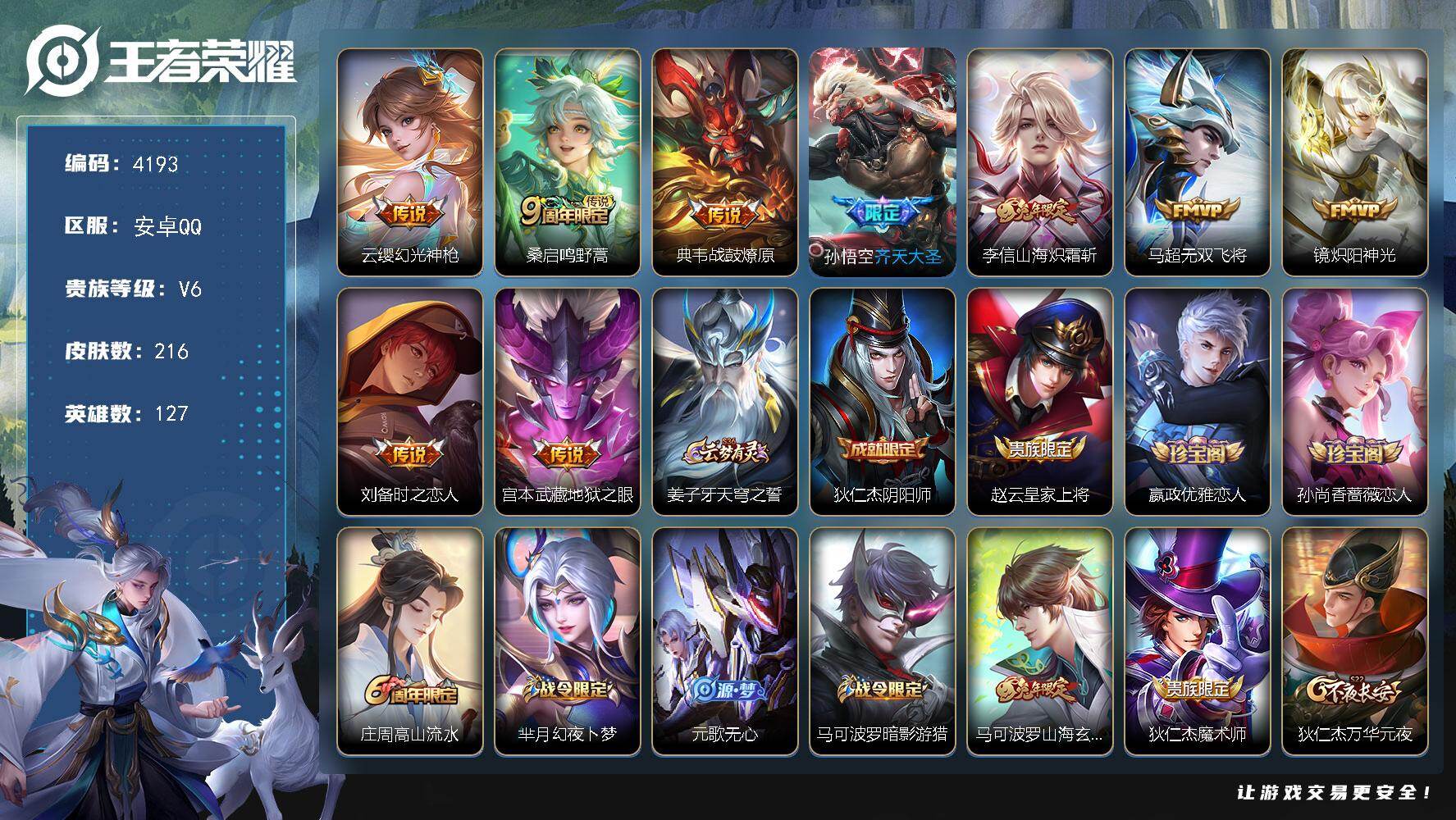 安卓Q-V6-永恒钻石III段位-127英雄-216皮肤-9传说-58史诗【