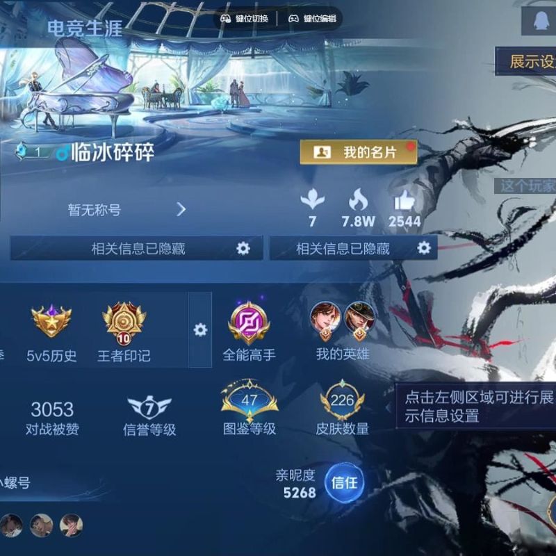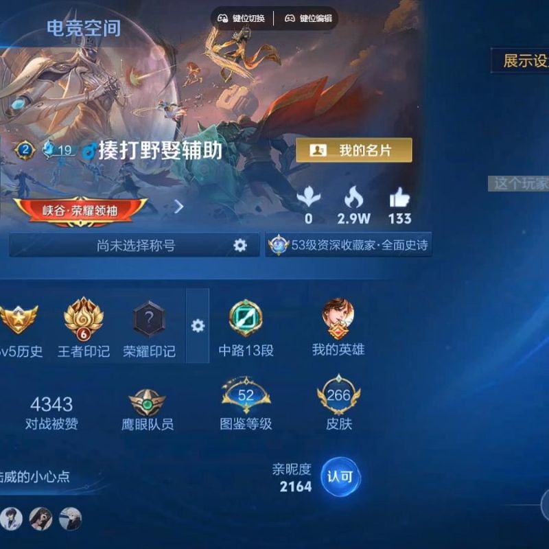 实名: 可修改 贵族等级: V6 英雄数: 126 皮肤数: 161 荣耀水晶