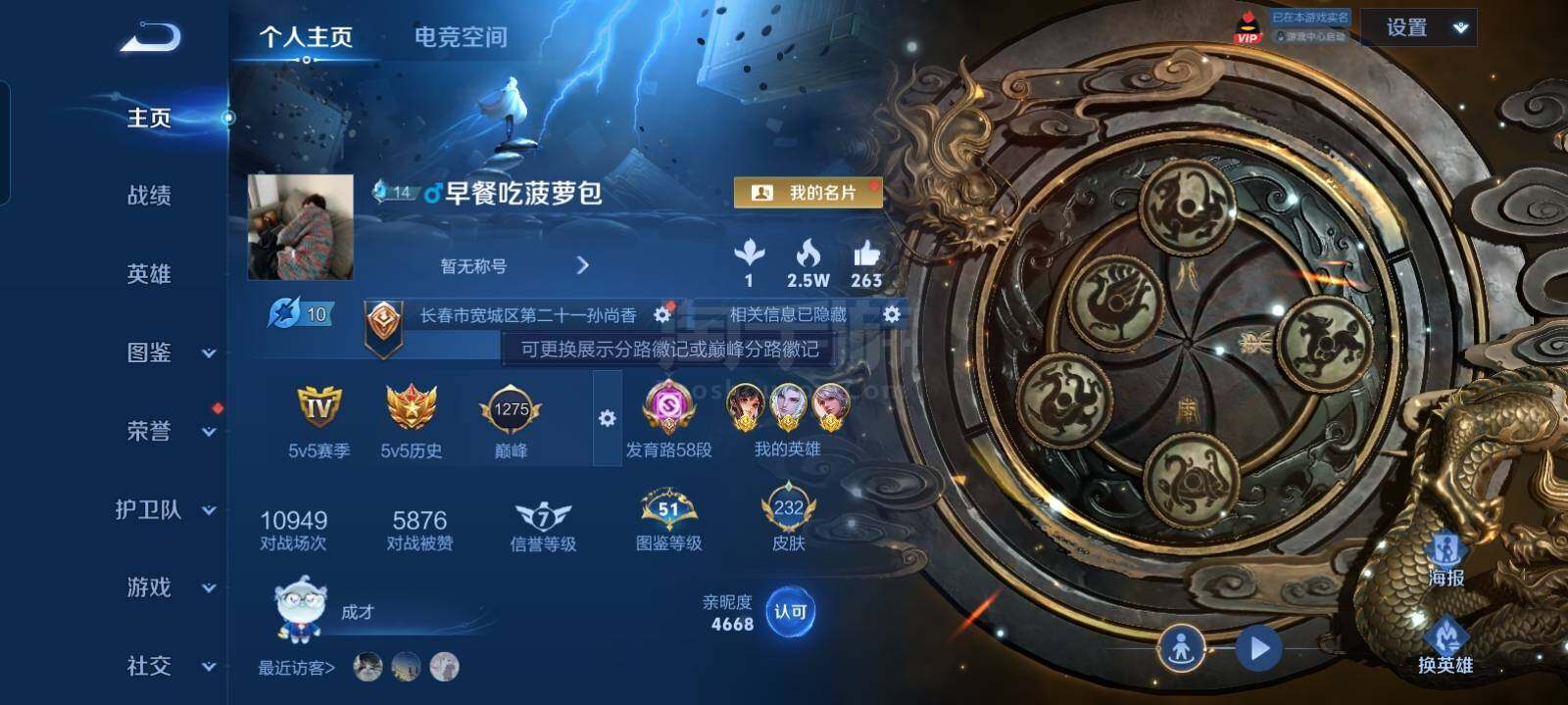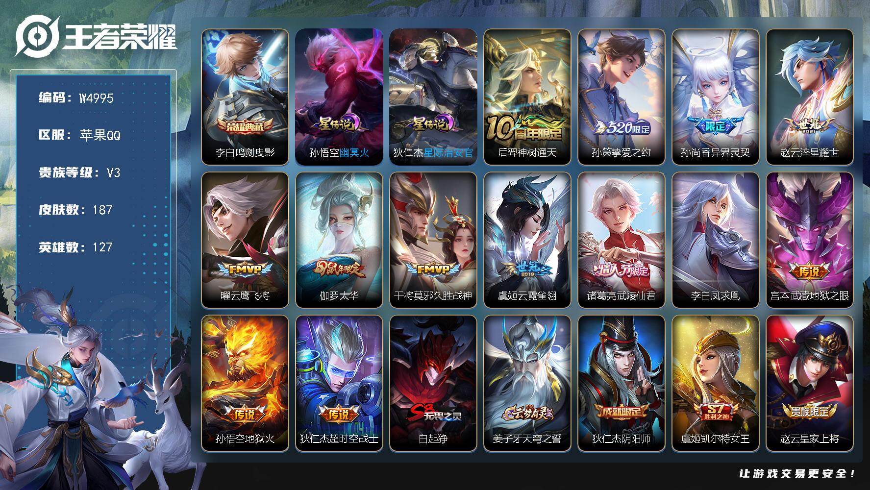 实名: 可修改 贵族等级: V7 英雄数: 118 皮肤数: 139 传说皮: