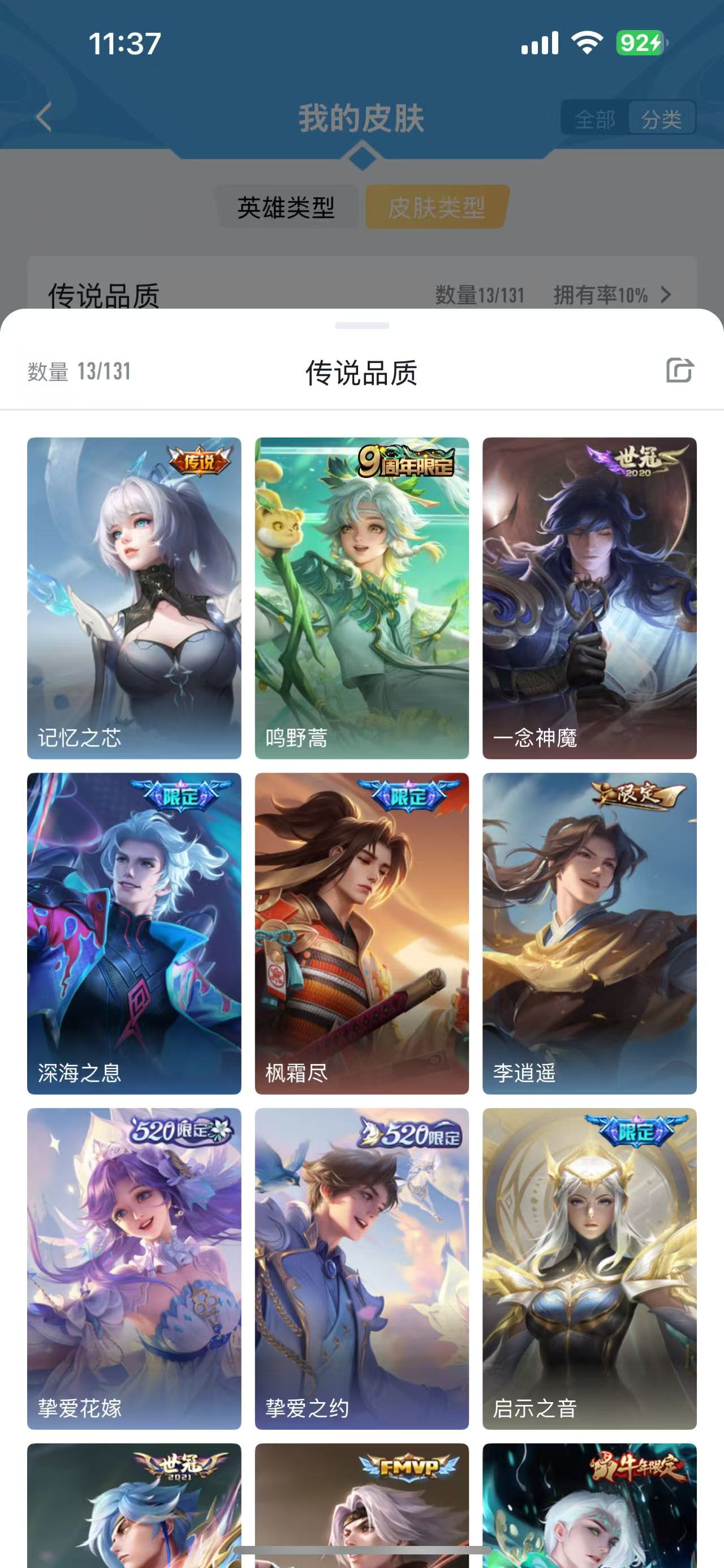 安卓QQ-1典藏-6传说-193皮肤-123英雄-至尊星耀-