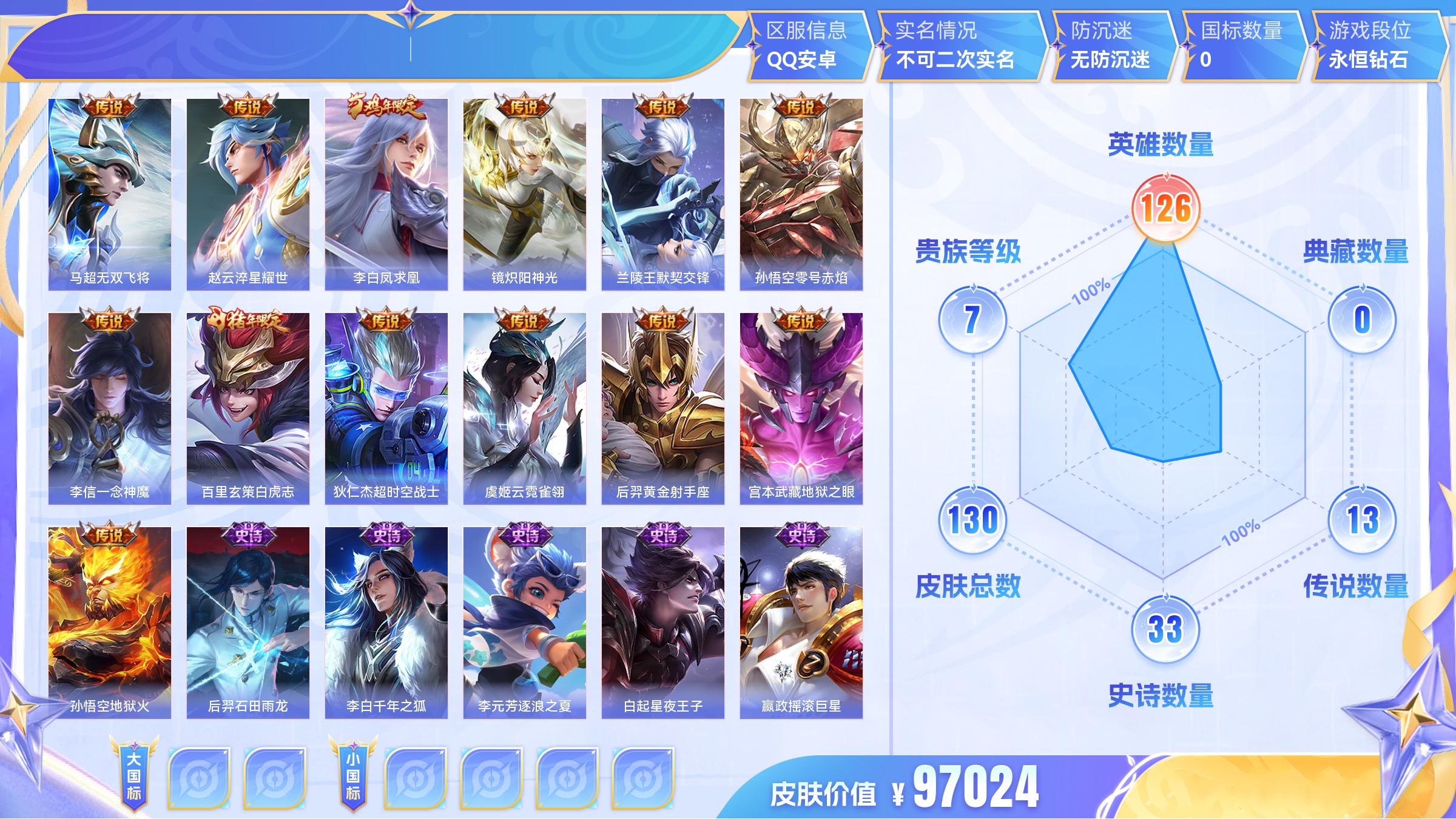 传说13 史诗33 限定38 英雄126 皮肤130