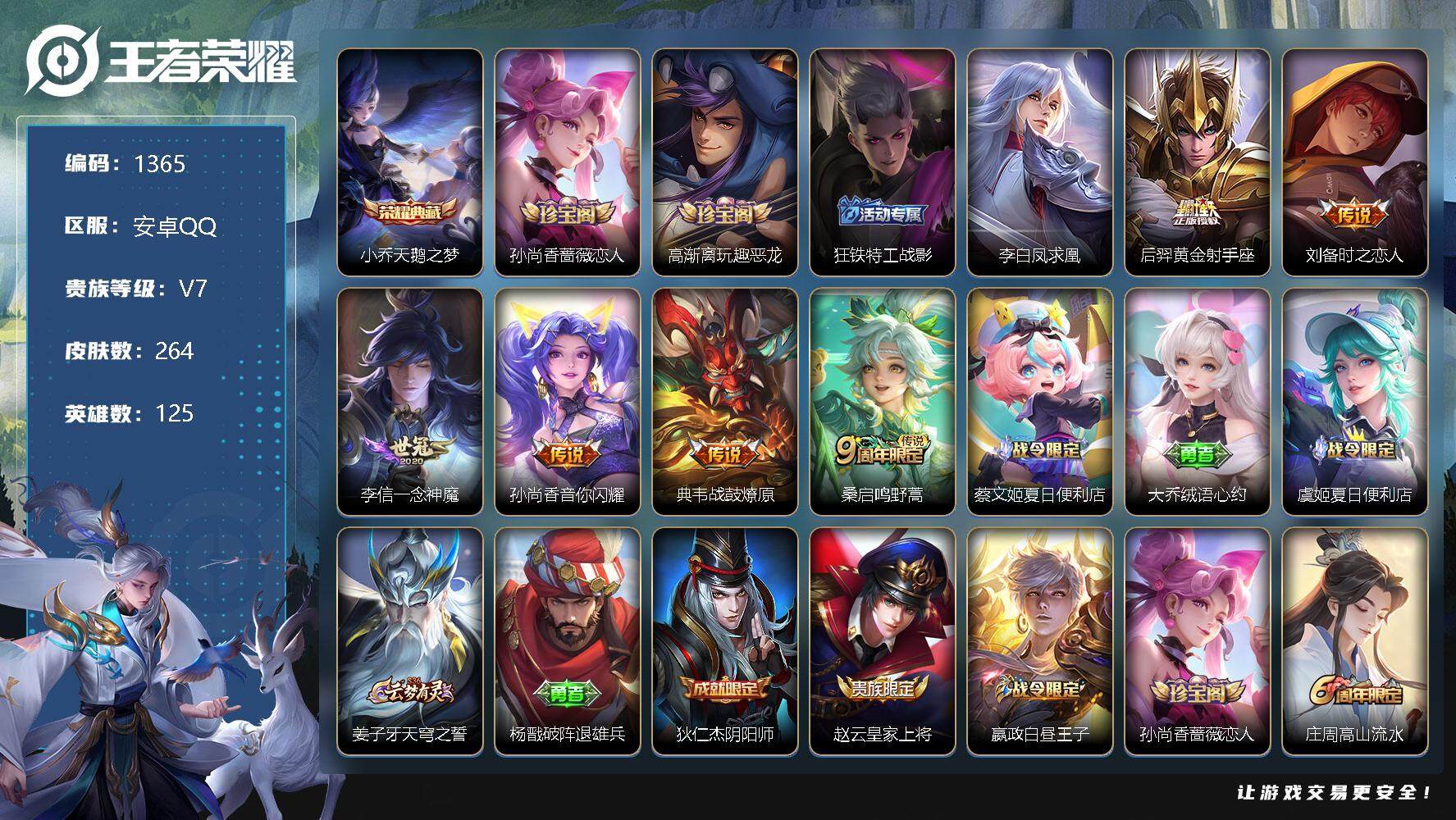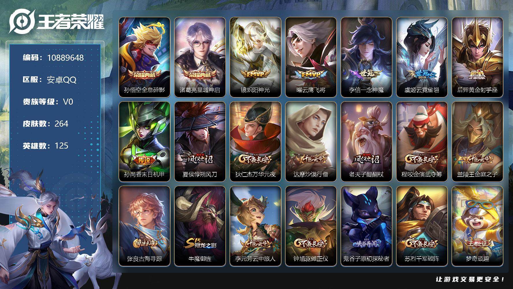 安卓QQ-V7-至尊星耀III段位-125英雄-264皮肤-1典藏