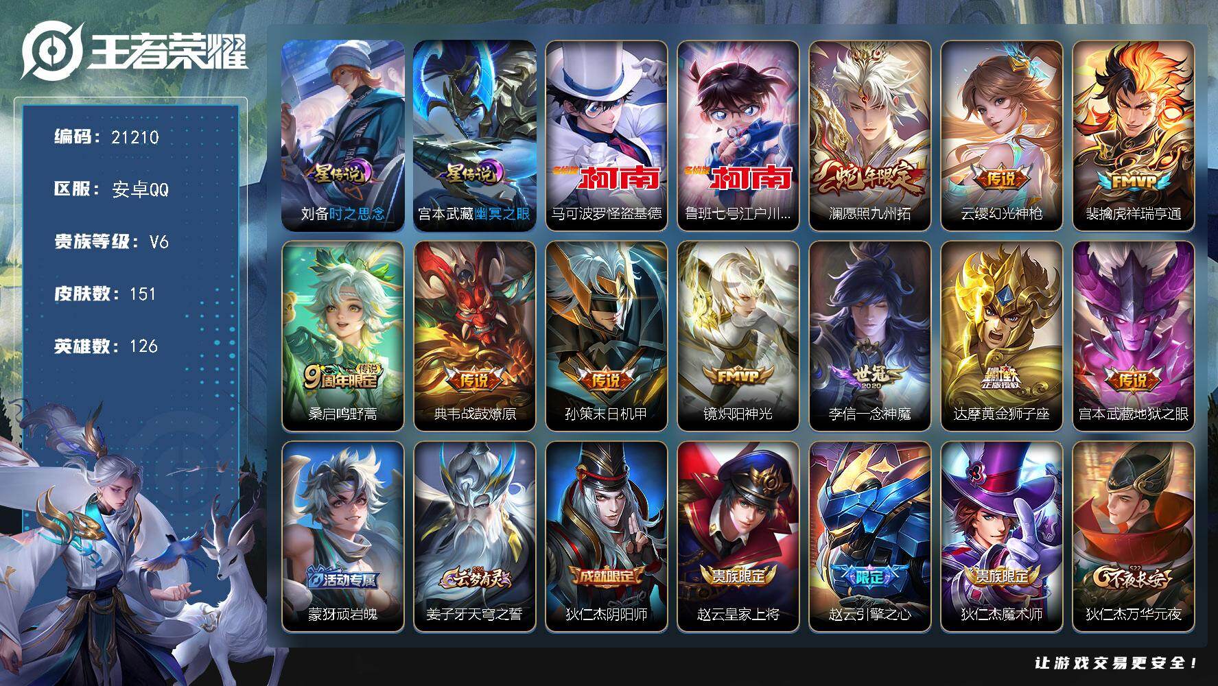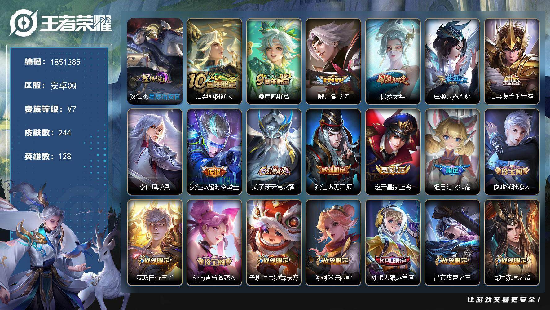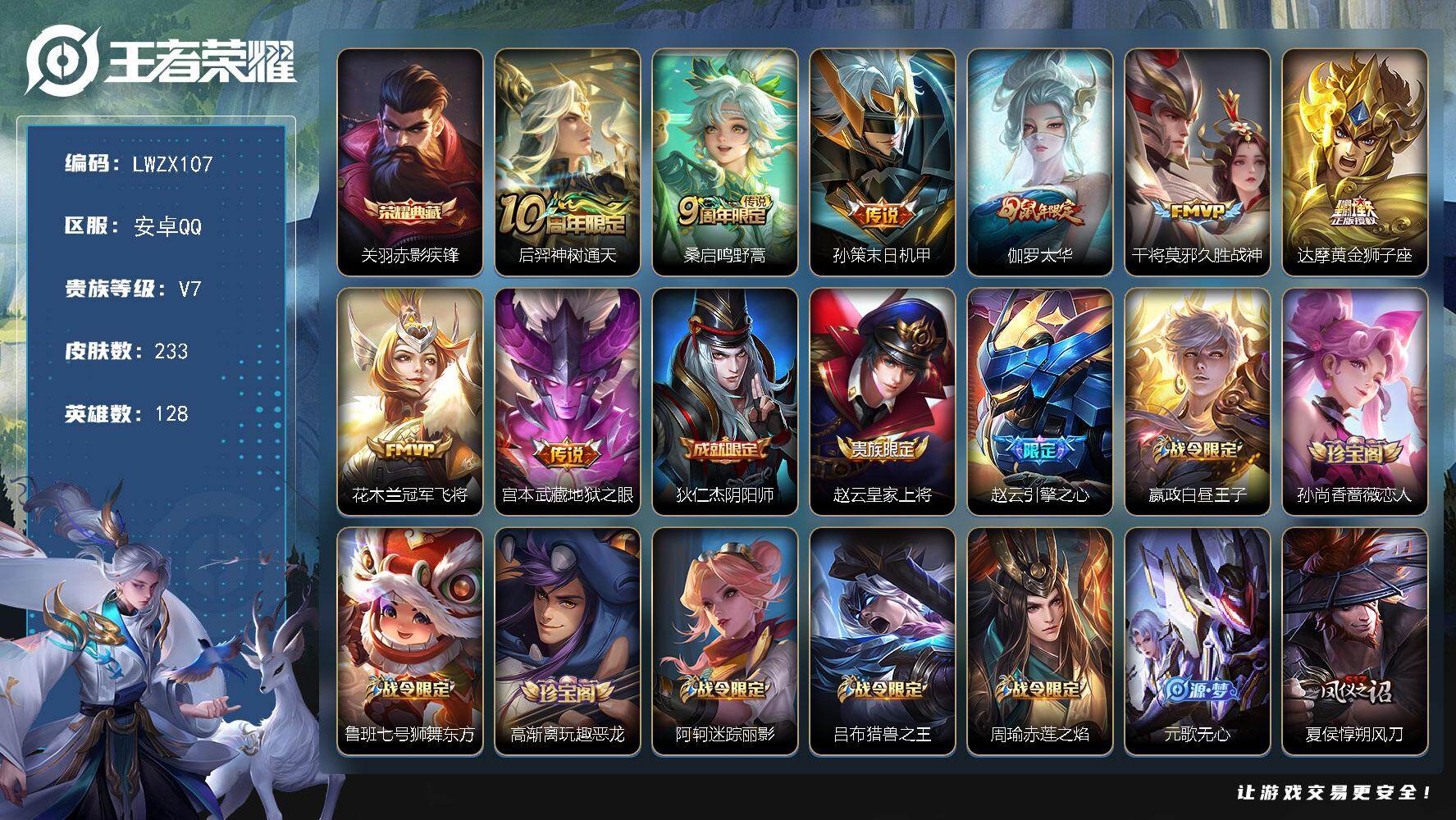 实名: 可修改 贵族等级: V7 英雄数: 126 皮肤数: 231 传说皮: