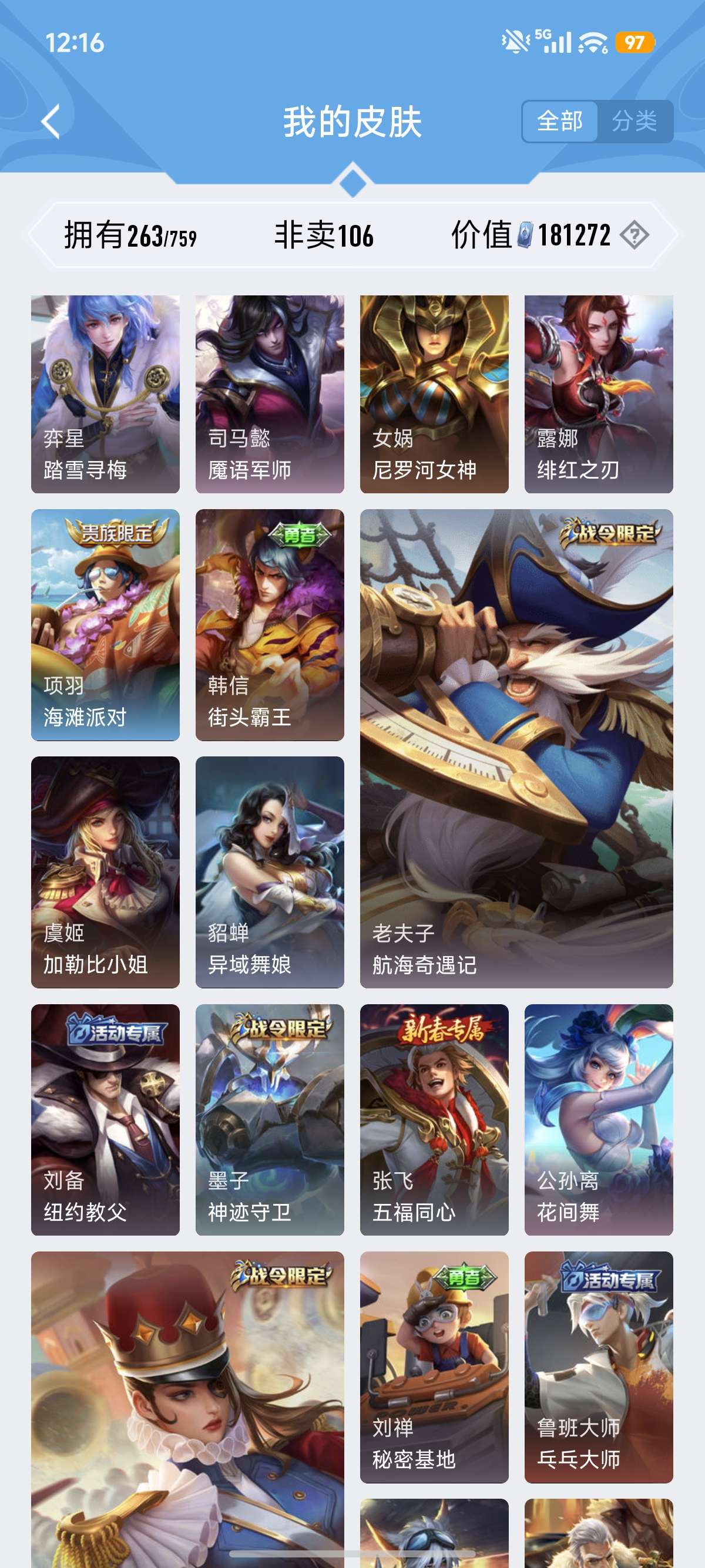 韩信典藏/愿照澜/零号+行者猴子皮肤数量284印记总数8V7