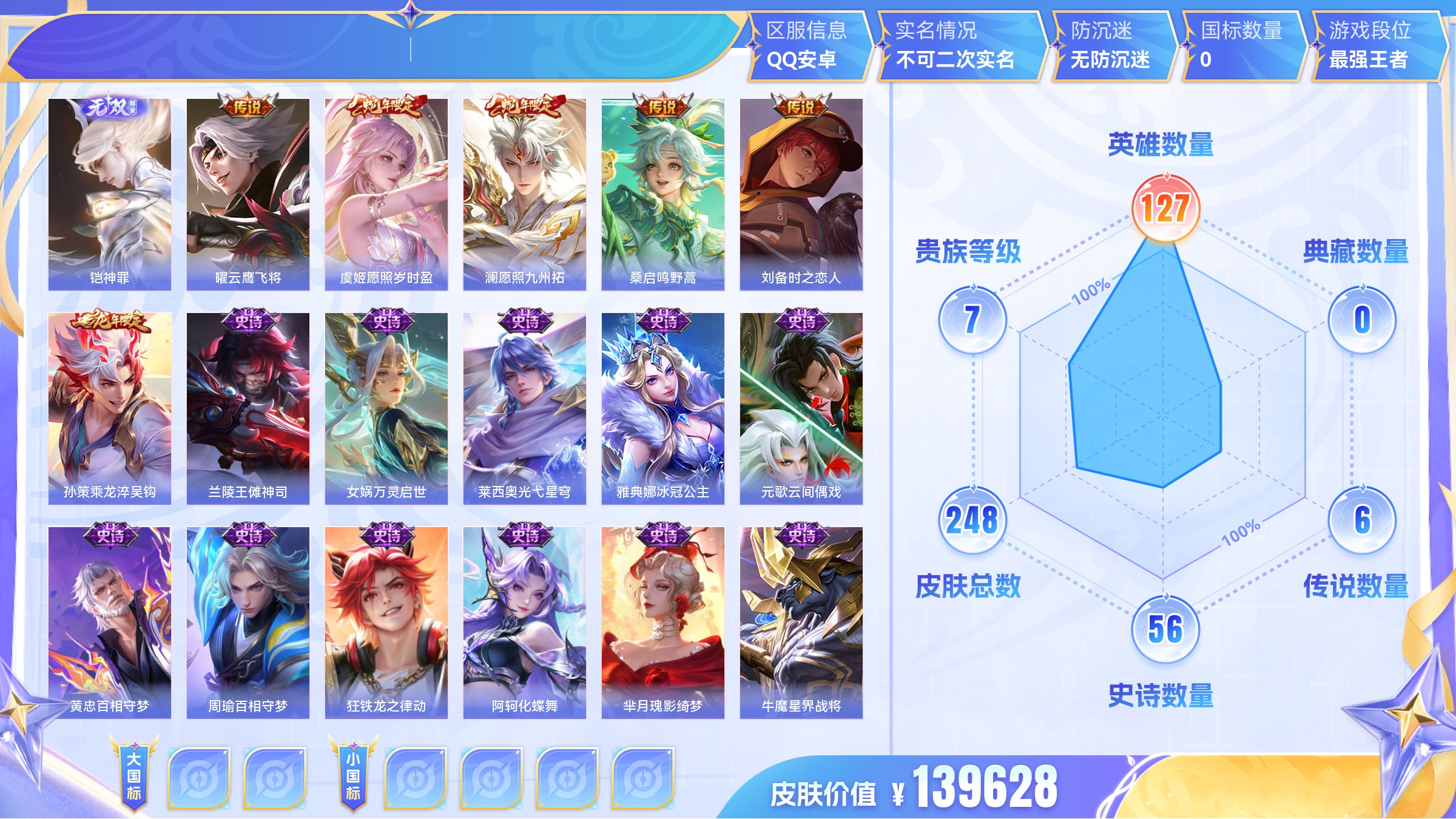 安卓QQ 皮肤227 英雄127 传说11 其他皮肤70 至尊星耀-