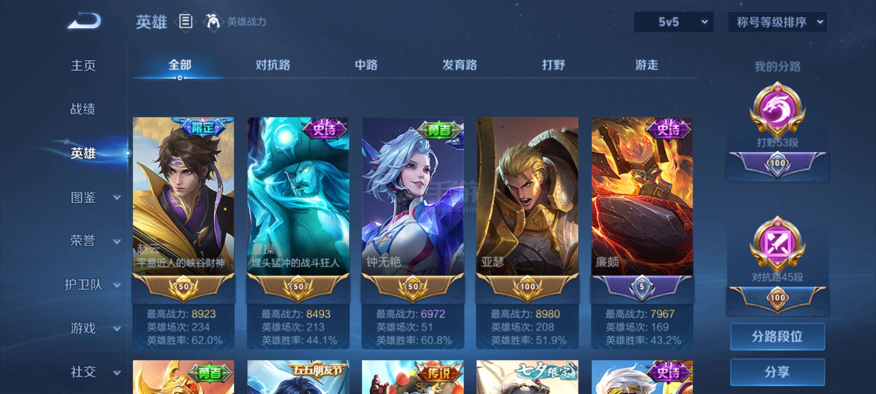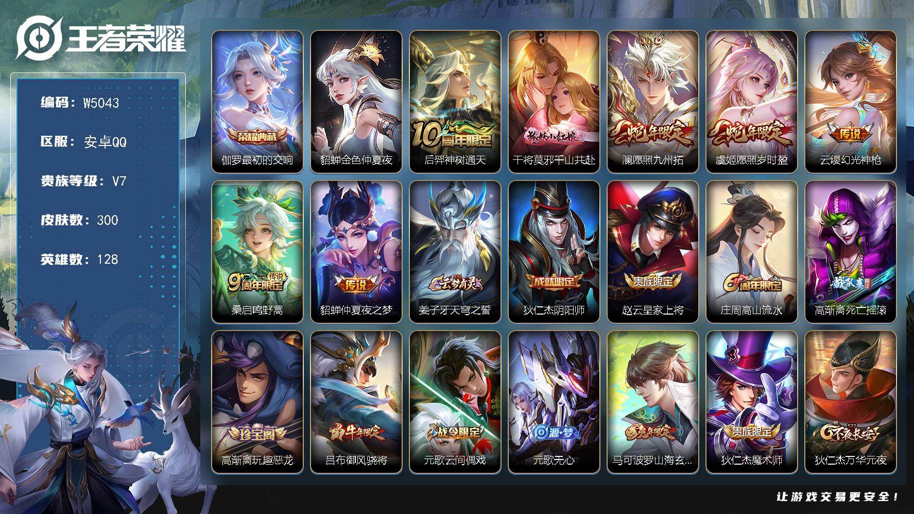 【W5043】发育路42段-安卓QQ-有二次-贵7-128英雄-300皮肤-1