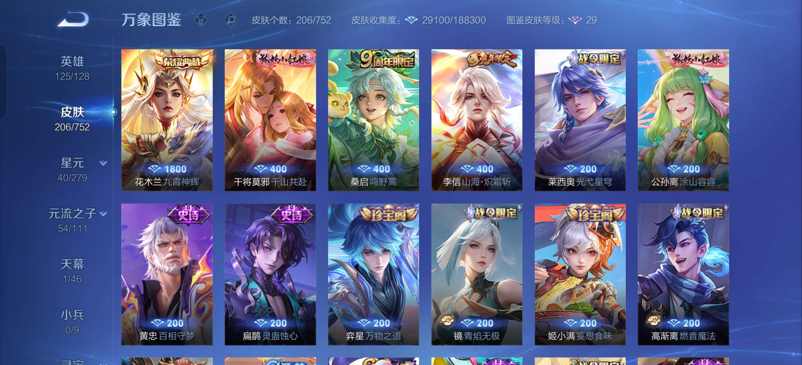 皮肤206 英雄125 至尊星耀 荣耀典藏1 传说3 其他皮肤94-王者1典藏3传说一些史诗,火影1