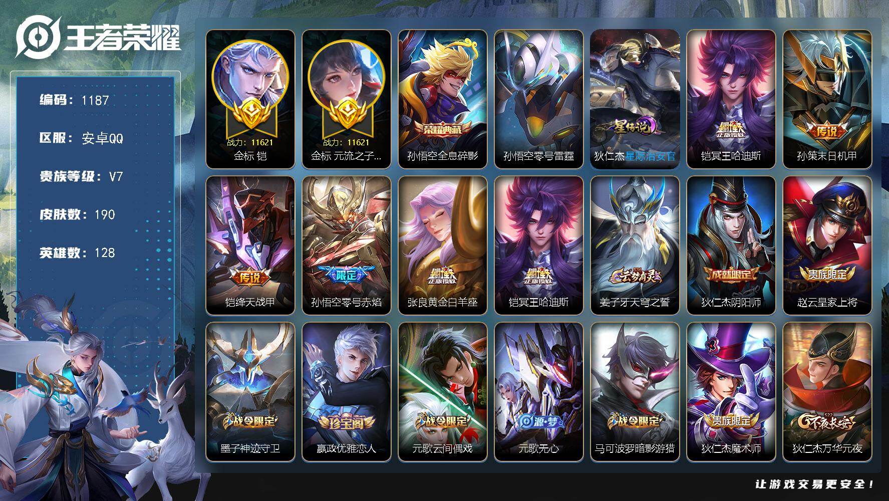 2金标,2星传说,星币3100,安卓Q-V7--128英雄-190皮肤-1典藏