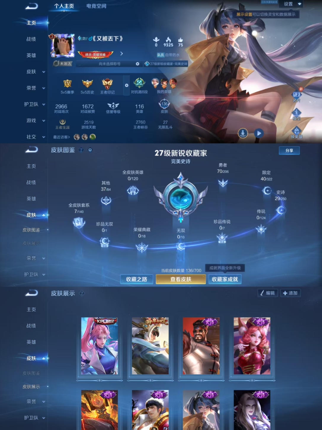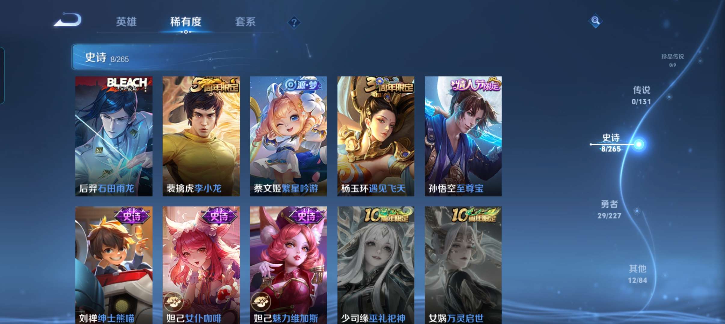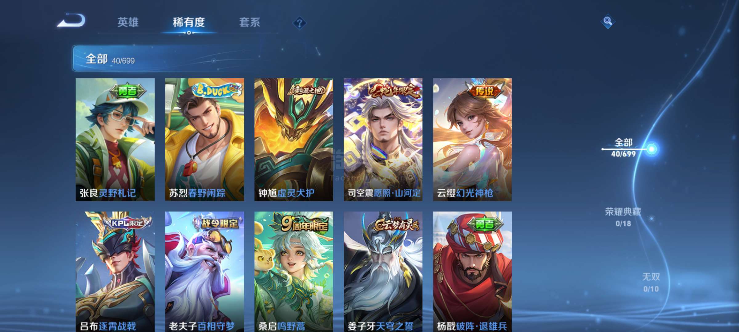 贵族等级: V4 英雄数: 97 皮肤数: 60 限定皮: 愿照·九州拓