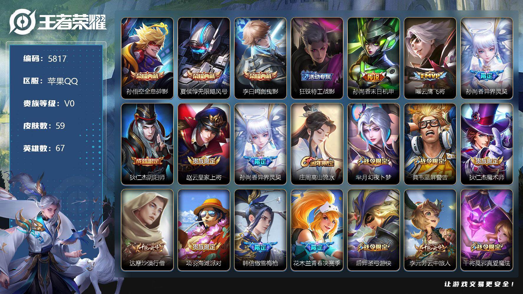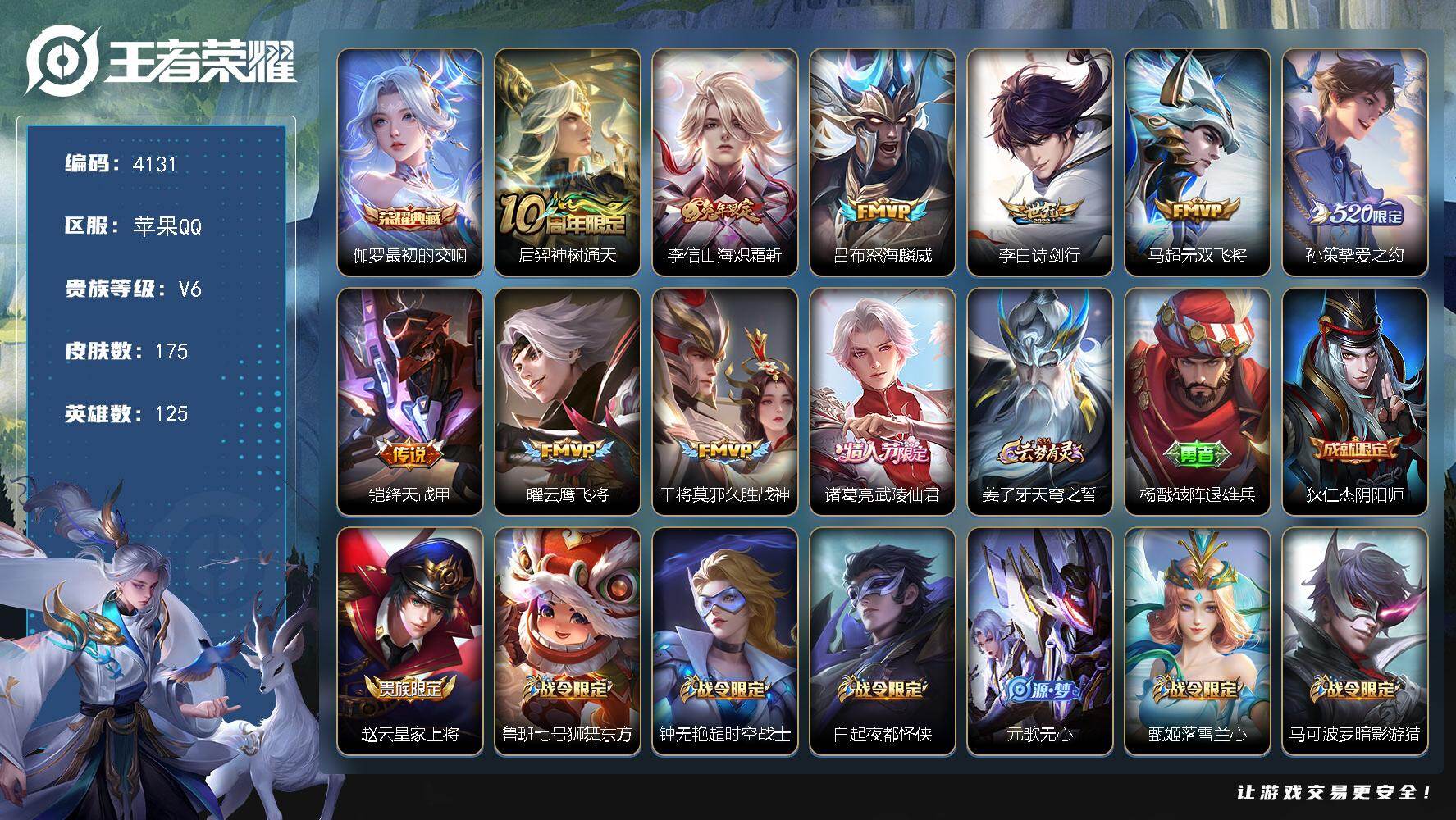 苹果Q-V1-尊贵铂金I段位-125英雄-175皮肤-1典藏皮肤-10传说-5