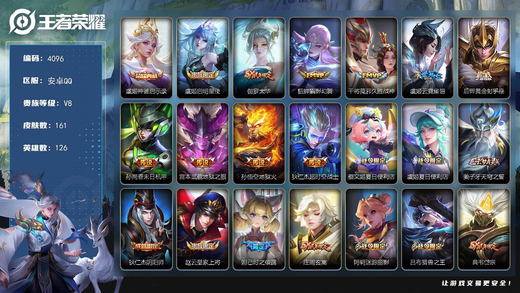 安卓Q-V3-荣耀黄金II段位-126英雄-161皮肤-1典藏皮肤-10传说-
