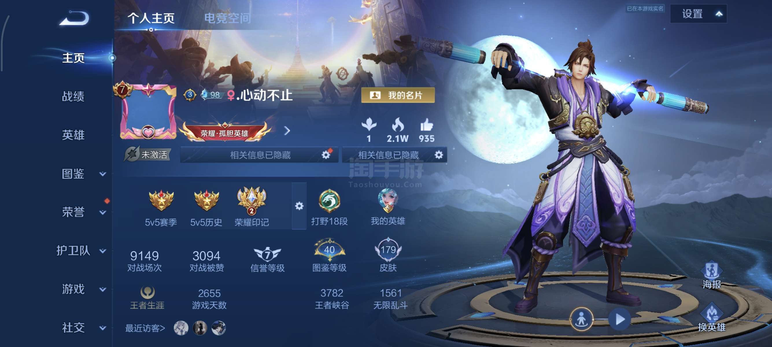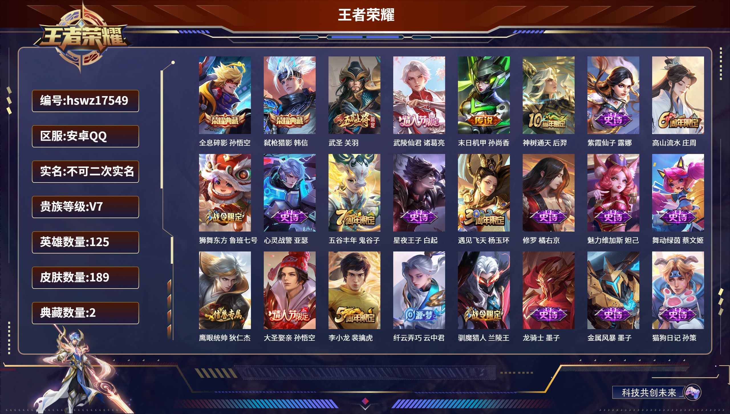安卓QQ/至尊星耀/189皮肤/125英雄/2典藏/0珍品无双/0无双/0珍品传说/4传说/42史诗