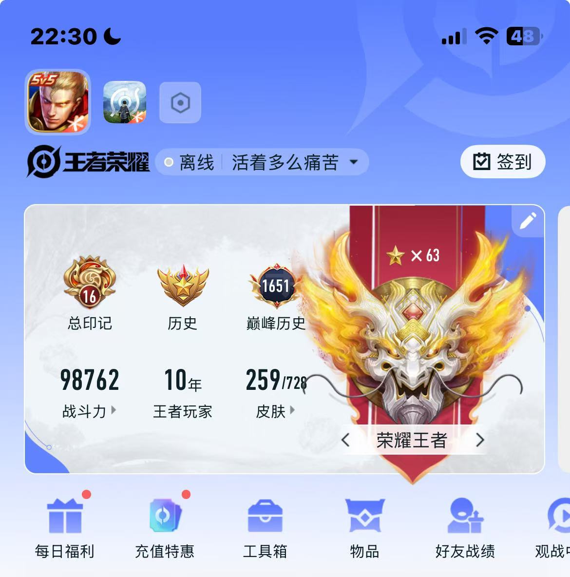 出ios王者号,段位63星,259皮肤贵族8,市标公孙离孙尚香上官婉儿刘备,号上有两百多点卷,急出