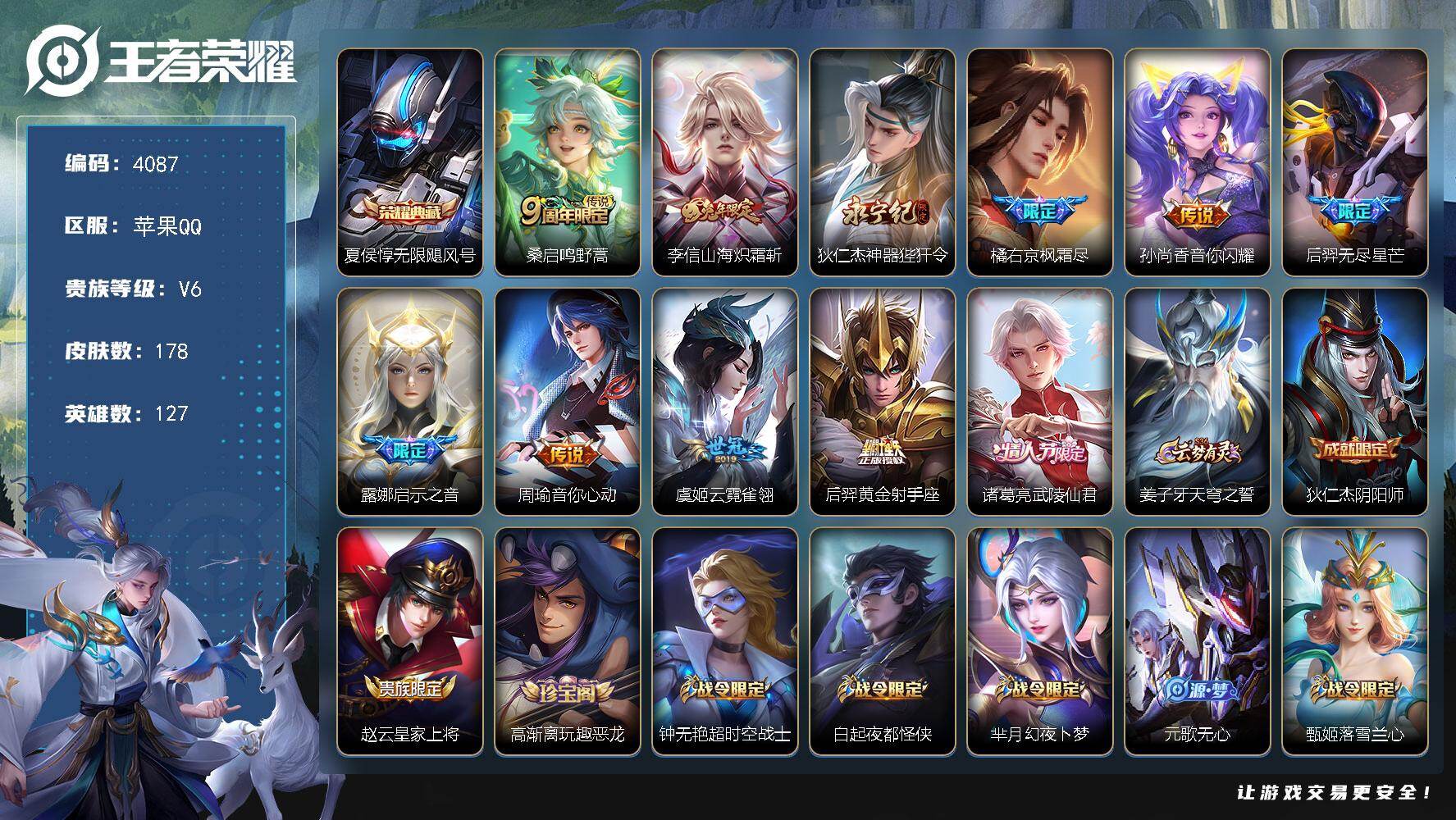 苹果Q-V6-至尊星耀III段位-127英雄-178皮肤-1典藏皮肤-11传说
