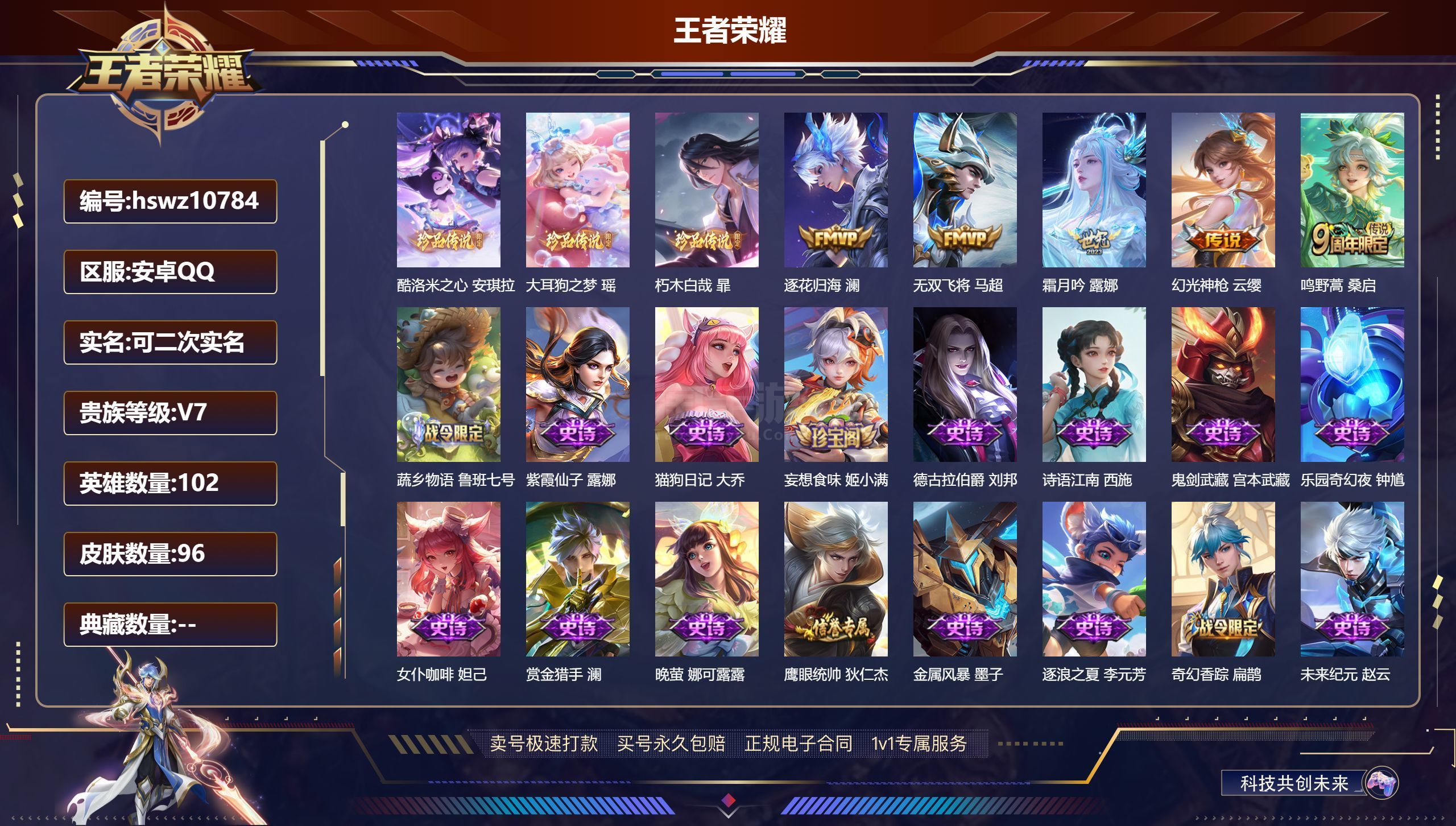 hswz10784 安卓QQ/永恒钻石/96皮肤/102英雄/0典藏/0珍品无双/0无双/3珍品传说
