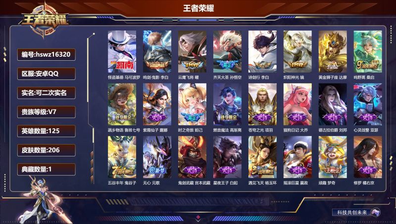 安卓QQ/最强王者/206皮肤/125英雄/1典藏/0珍品无双/0无双/1珍品传说/6传说/58史诗