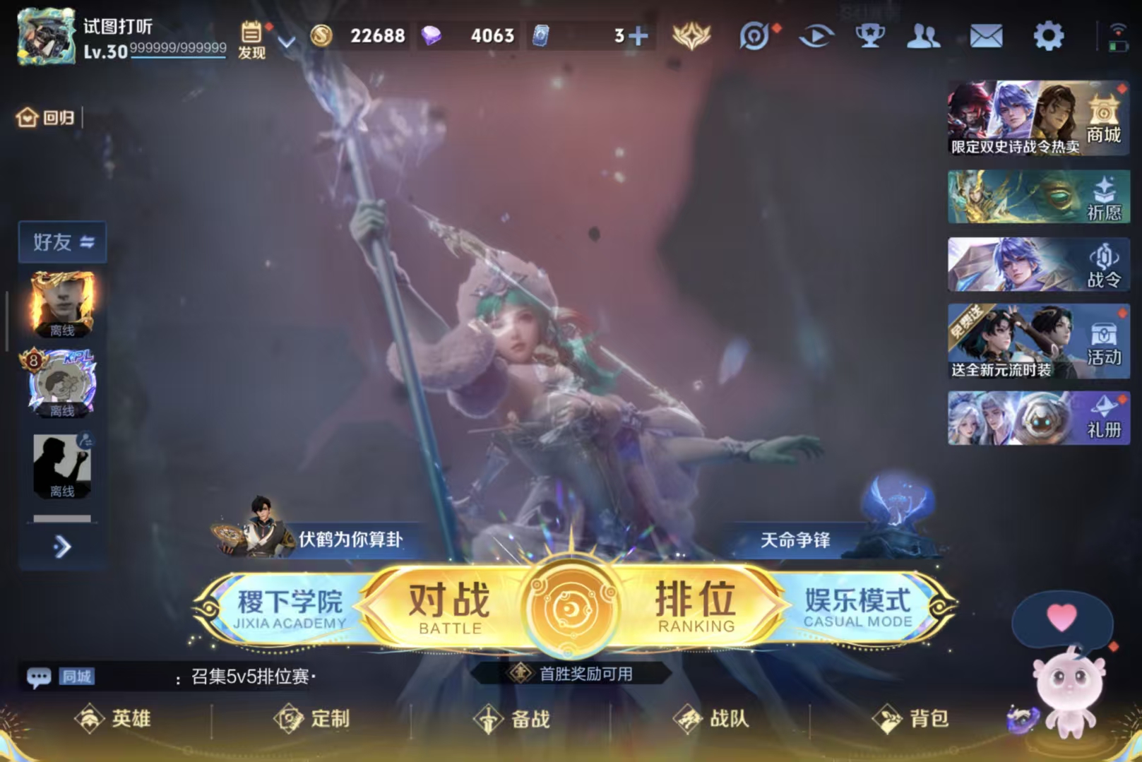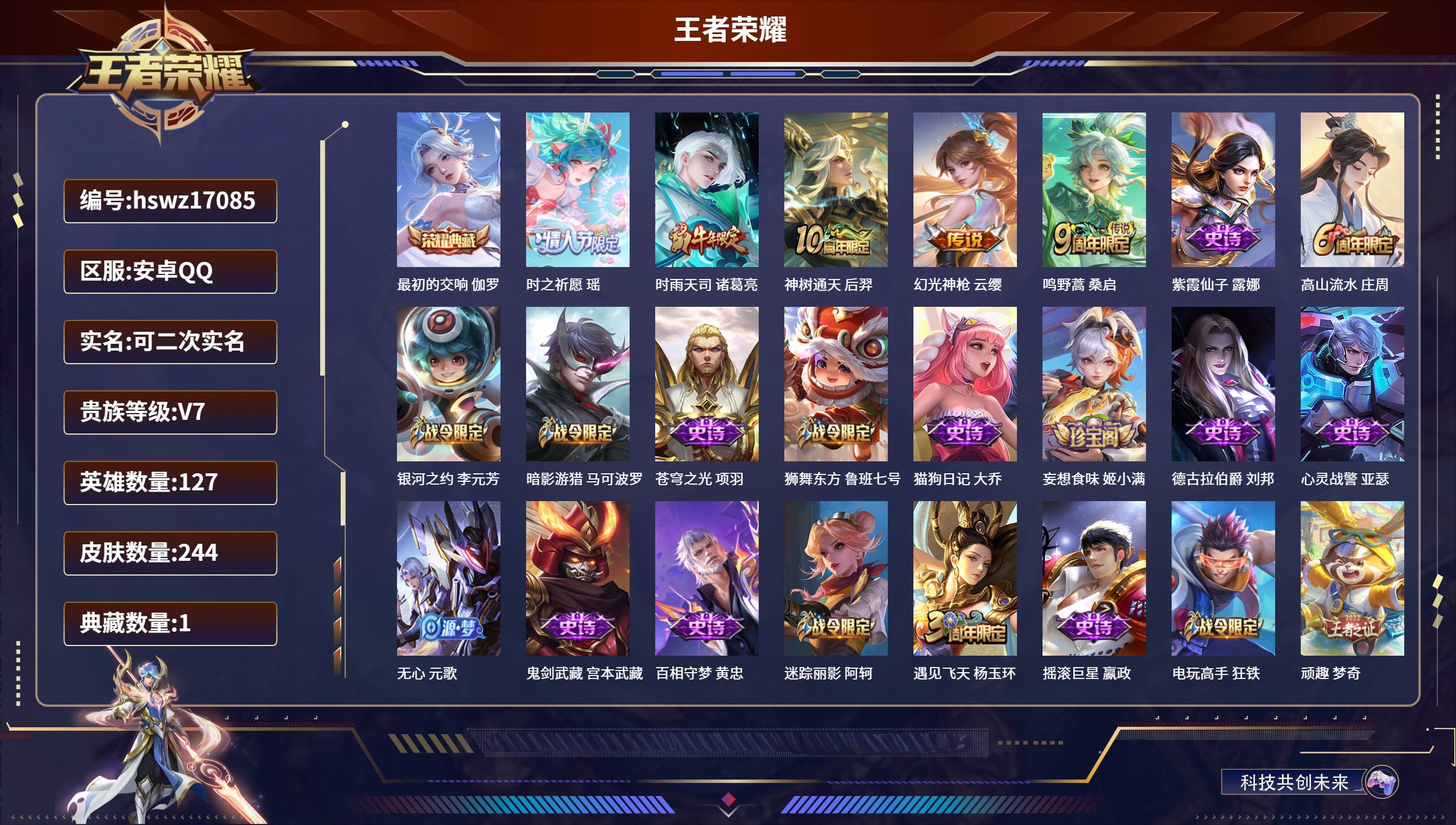 安卓QQ/至尊星耀/244皮肤/127英雄/1典藏/0珍品无双/0无双/0珍品传说/5传说/76史诗