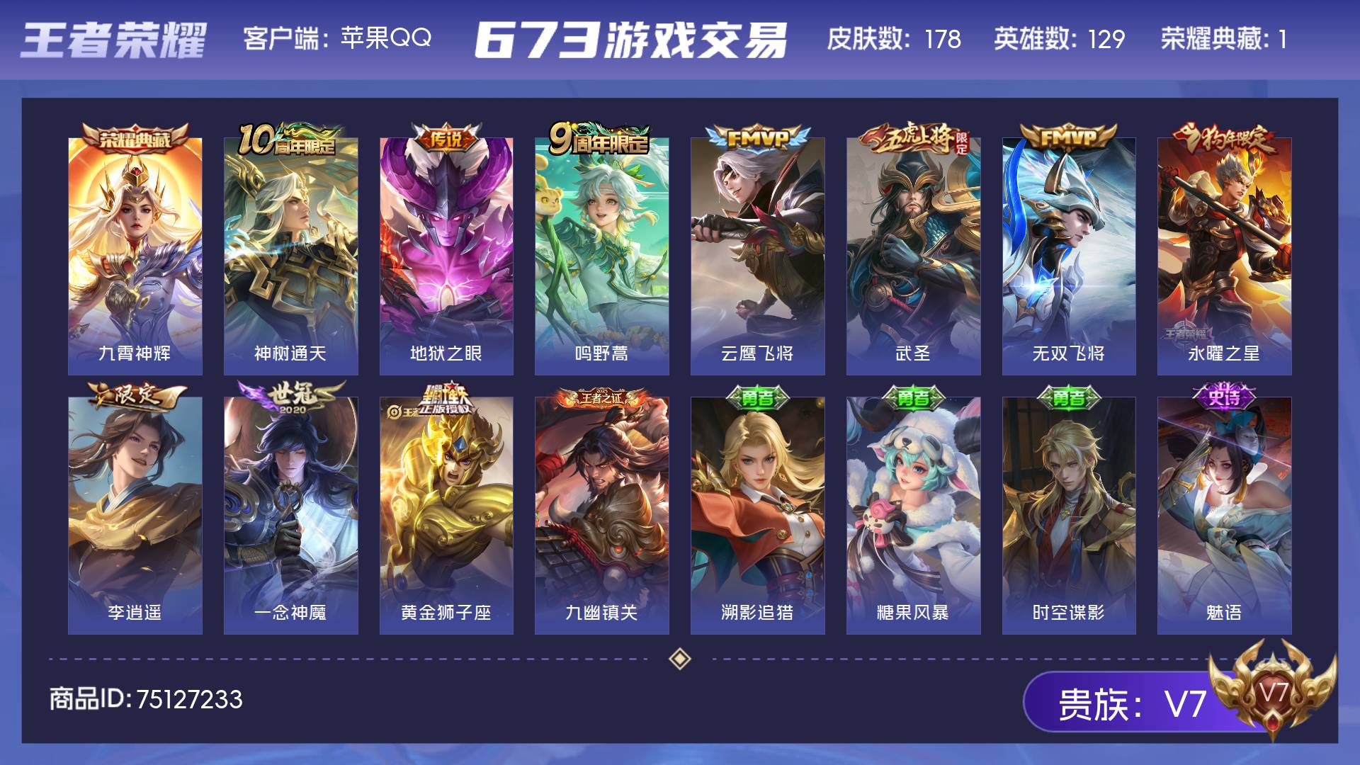 V7 皮肤178 英雄129 永恒钻石 荣耀典藏1 传说10 其他皮肤173