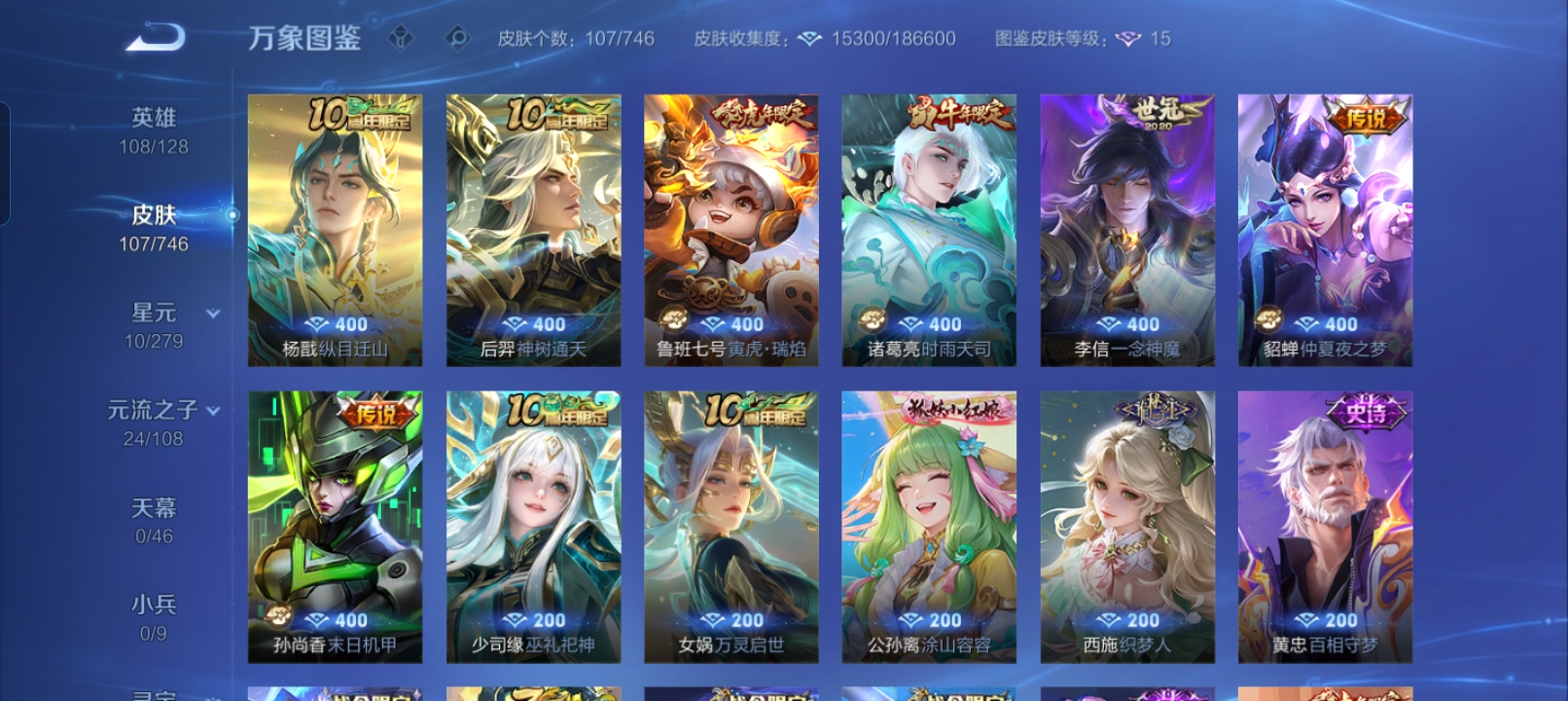 皮肤10 英雄129 至尊星耀 荣耀典藏1 传说1 其他皮肤10