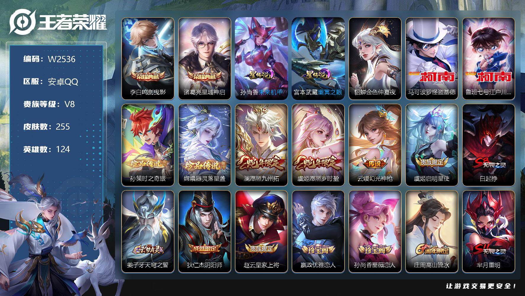 【W2536】安卓Q-不可二次-贵8-124英雄-255皮肤-2典藏(星域神启
