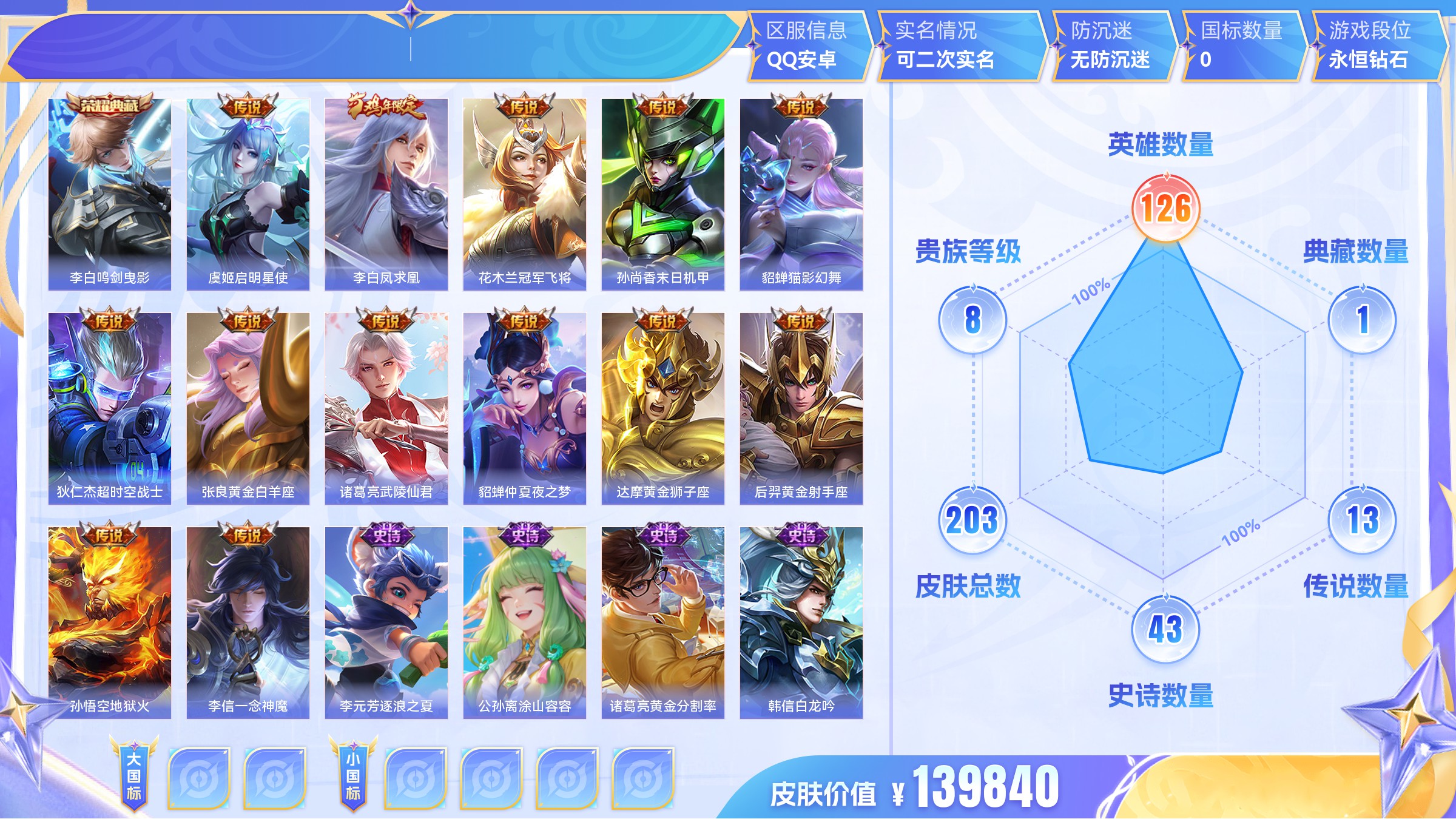 安卓QQ/绝世王者/263皮肤/126英雄/1典藏/0珍品无双/0无双/0珍品传说/5传说/73史诗