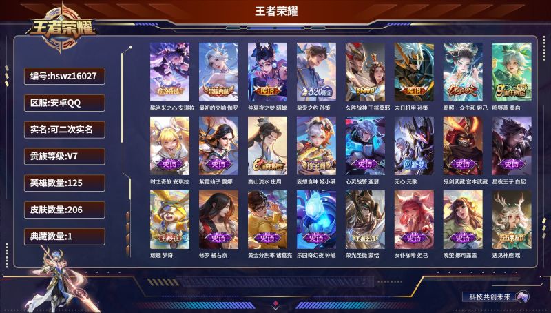 安卓QQ/尊贵铂金/206皮肤/125英雄/1典藏/0珍品无双/0无双/1珍品传说/6传说/58史诗