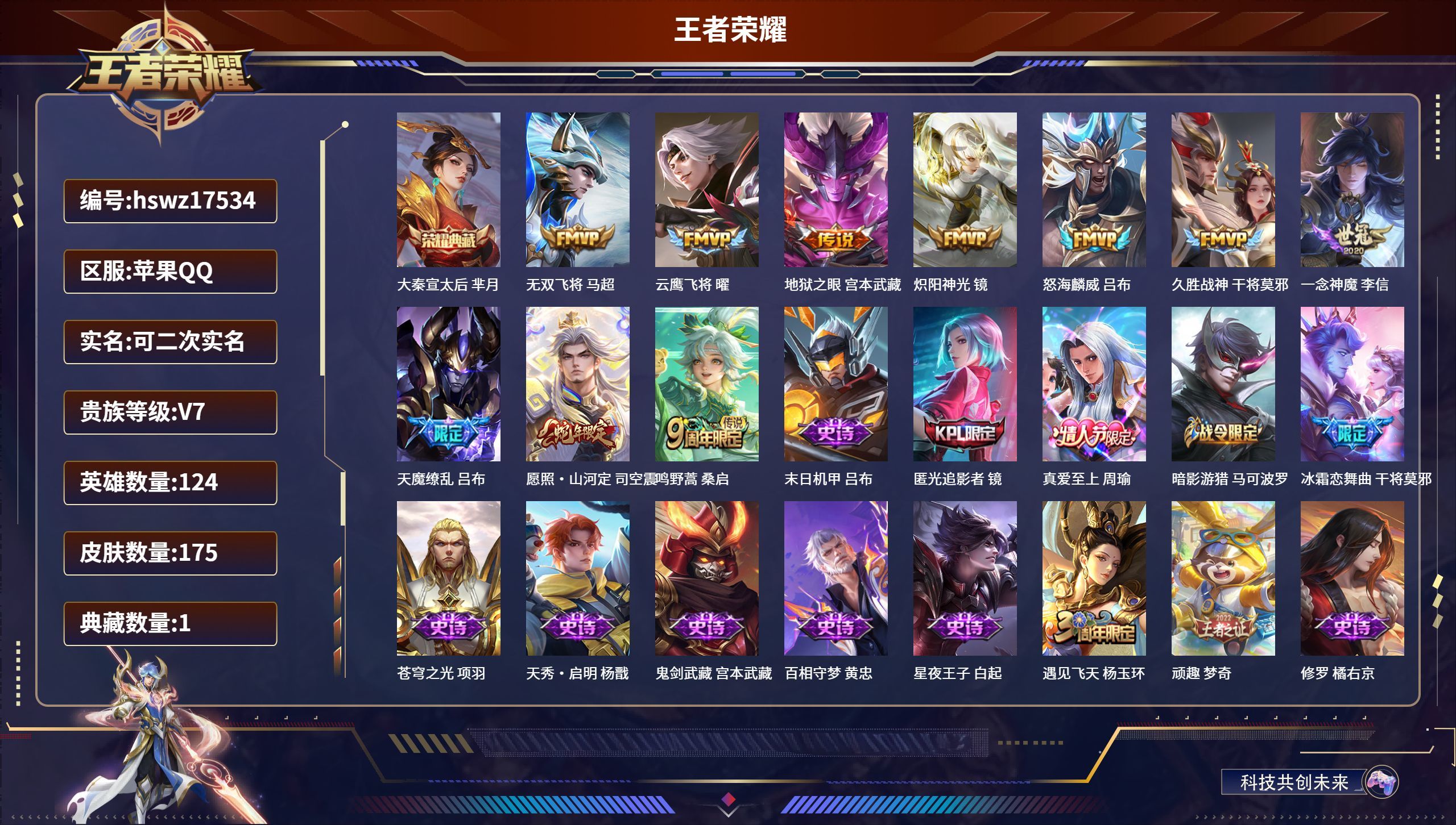 苹果QQ/永恒钻石/175皮肤/124英雄/1典藏/0珍品无双/0无双/0珍品传说/10传说/48史