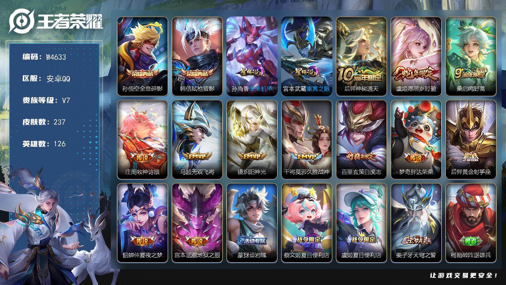 安卓QQ/永恒钻石/160皮肤/126英雄/1典藏/0珍品无双/0无双/2珍品传说/6传说/43史诗