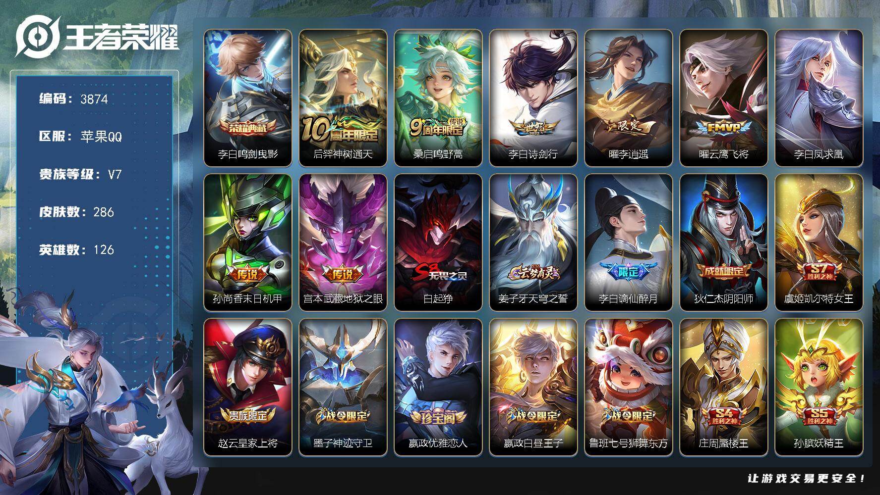 苹果Q-V7-至尊星耀III段位-126英雄-286皮肤-1典藏皮肤-8传说-
