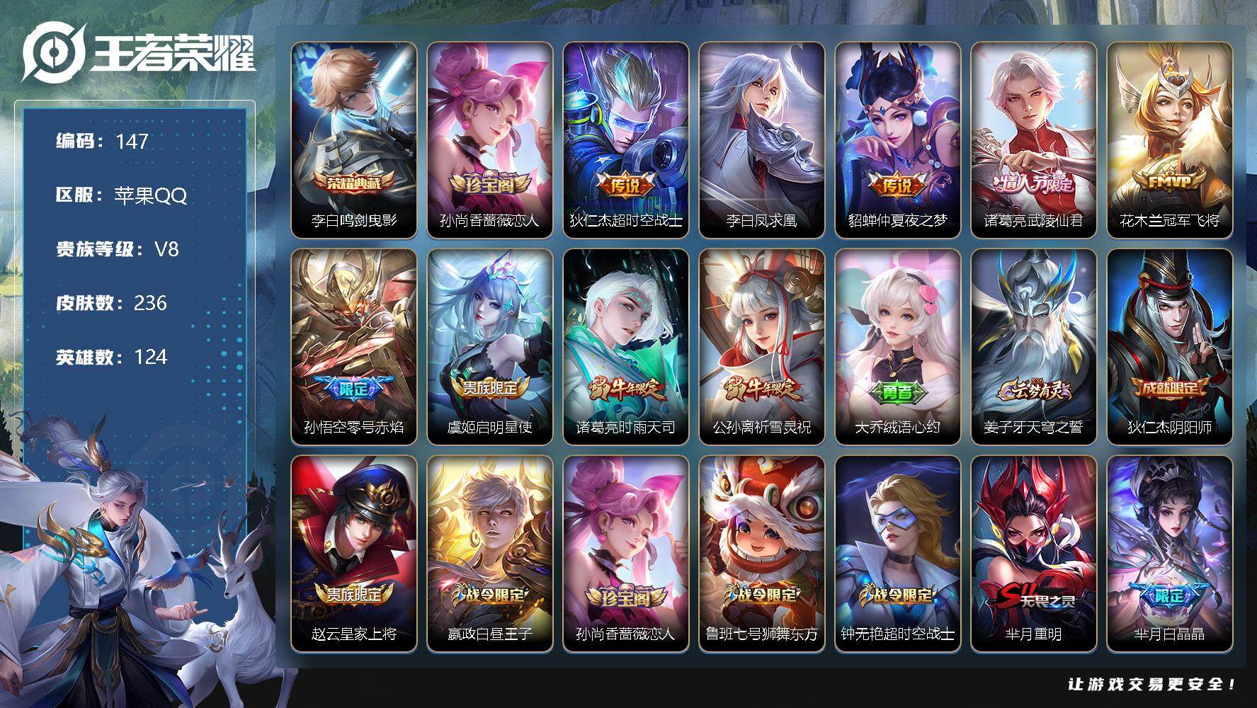 【商品标题】:苹果Q-V8-永恒钻石V段位-124英雄-236皮肤-1典藏-0