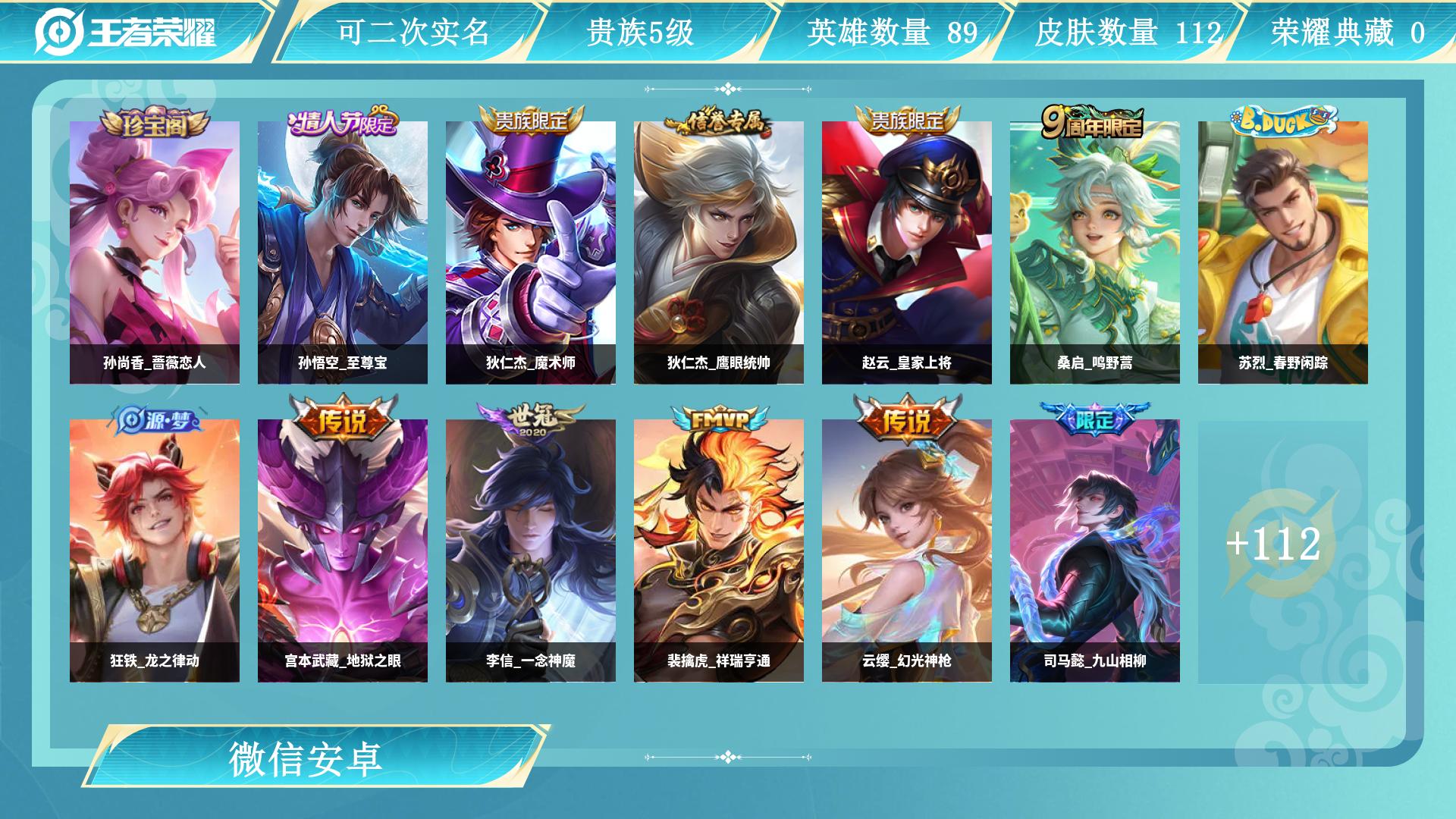 微信区 V7 有二次 皮肤145 英雄123 荣耀王者 传说8 其他皮肤57