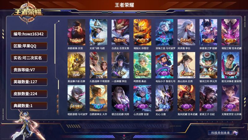 苹果QQ/至尊星耀/224皮肤/127英雄/1典藏/0珍品无双/0无双/0珍品传说/11传说/59史
