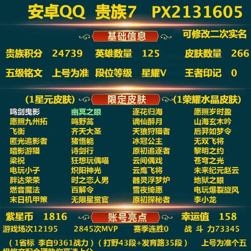 安卓QQ/永恒钻石/132皮肤/115英雄/1典藏/0珍品无双/0无双/3珍品传说/9传说/32史诗