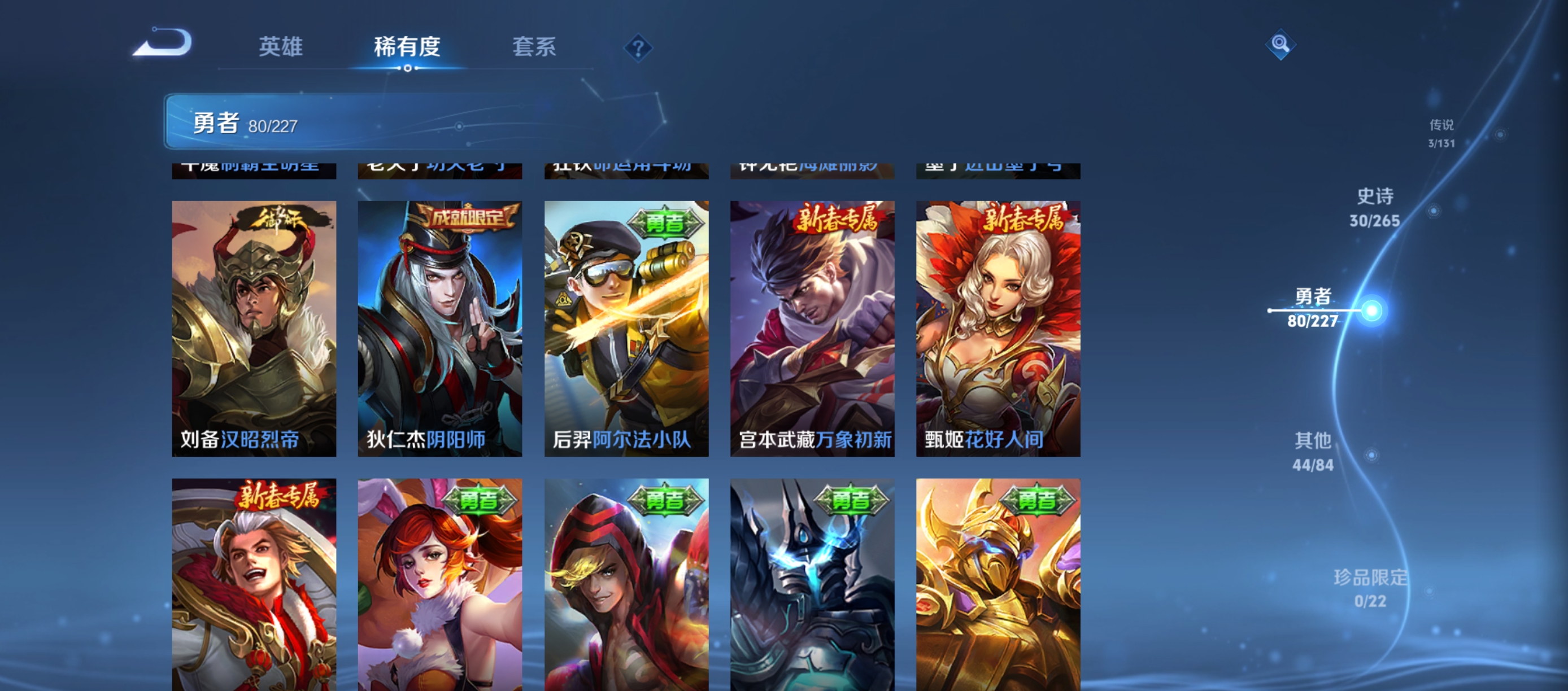 贵族等级: V4 英雄数: 74 皮肤数: 44 限定皮: 凤求凰,至尊宝