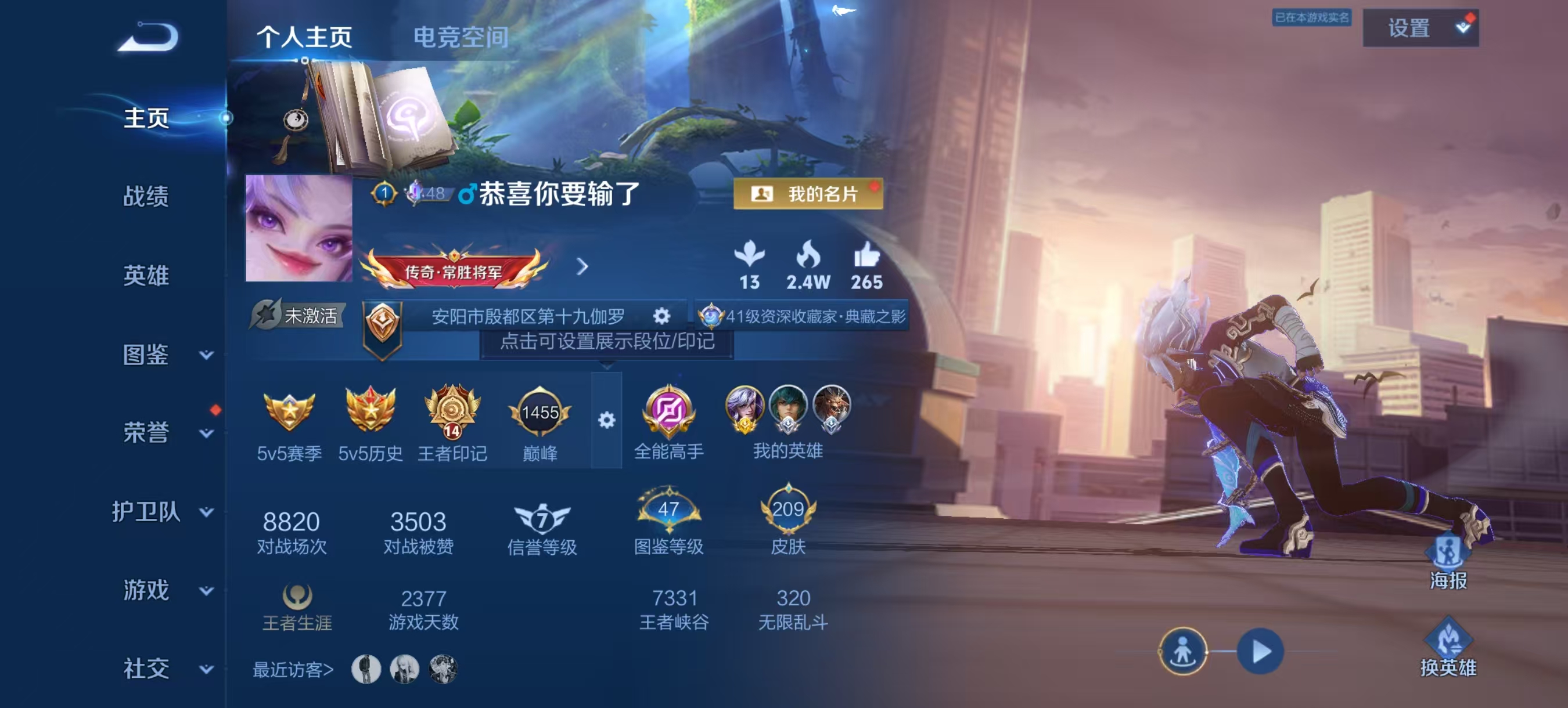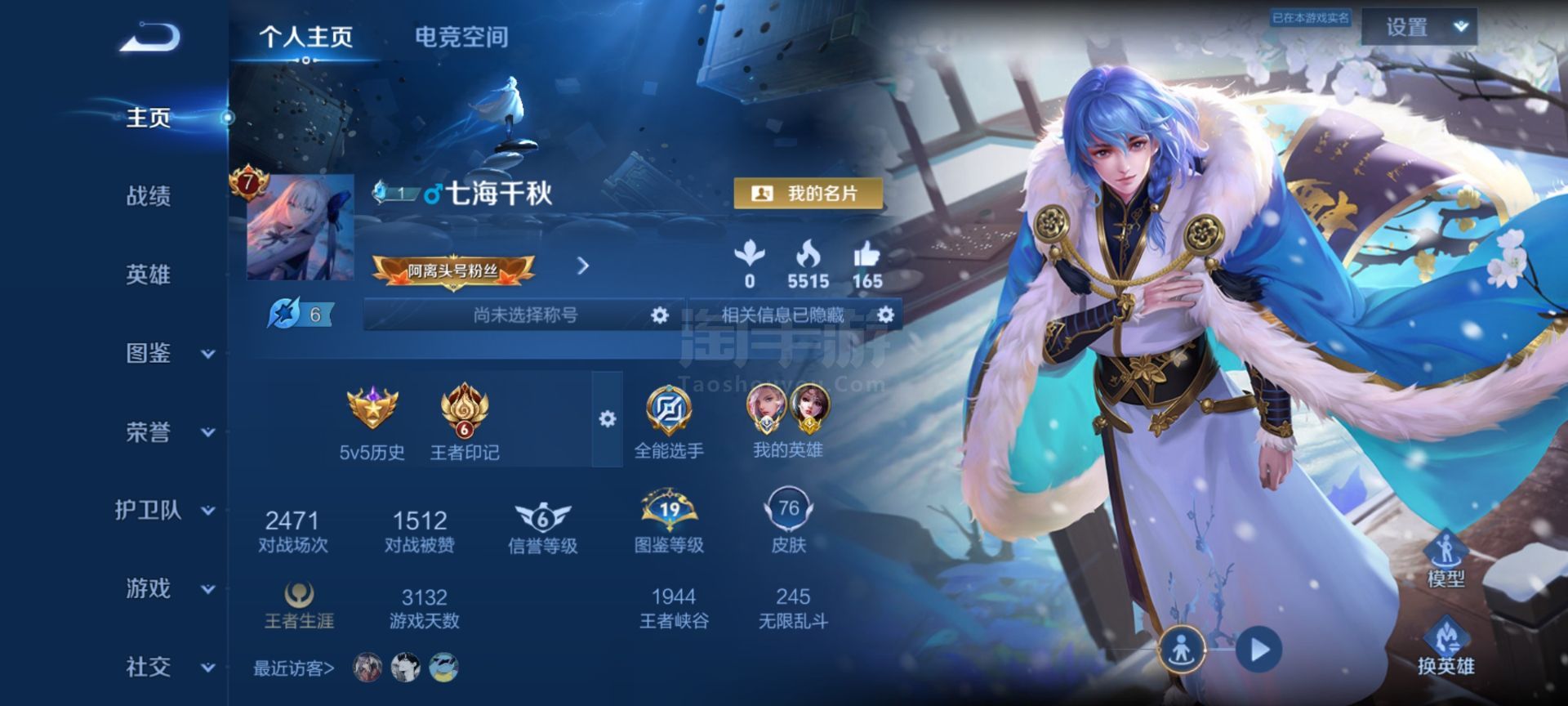 实名: 可修改 贵族等级: V7 英雄数: 128 皮肤数: 201 无双皮:
