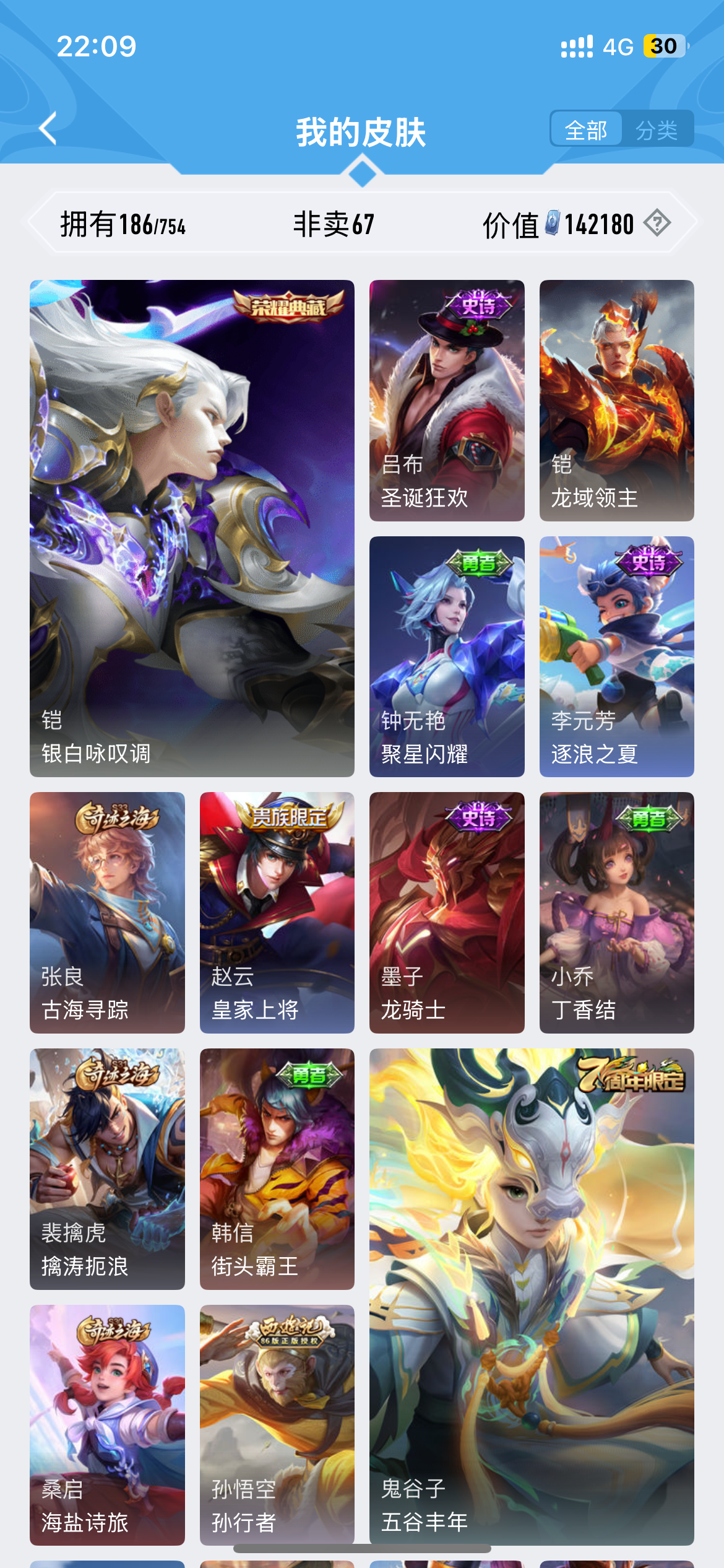 皮肤186 英雄128 荣耀王者 荣耀典藏1 无双皮肤2 传说16 其他皮肤66-推油