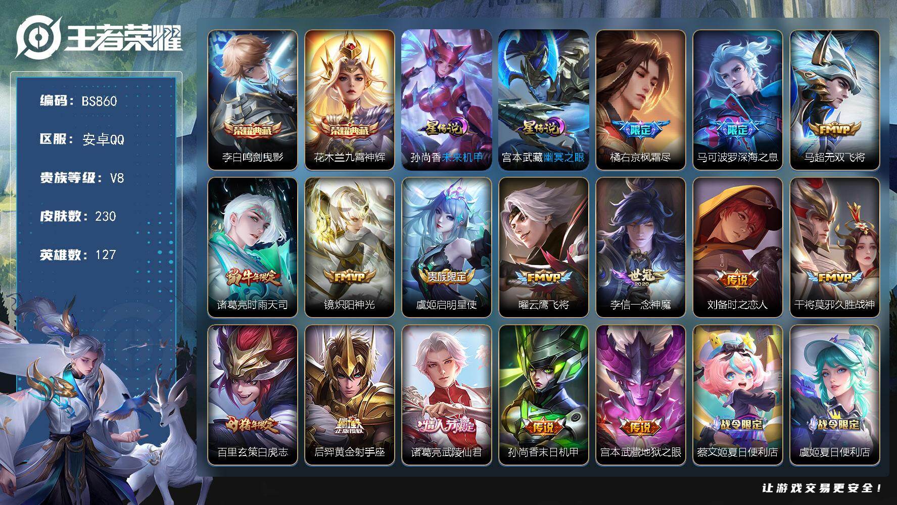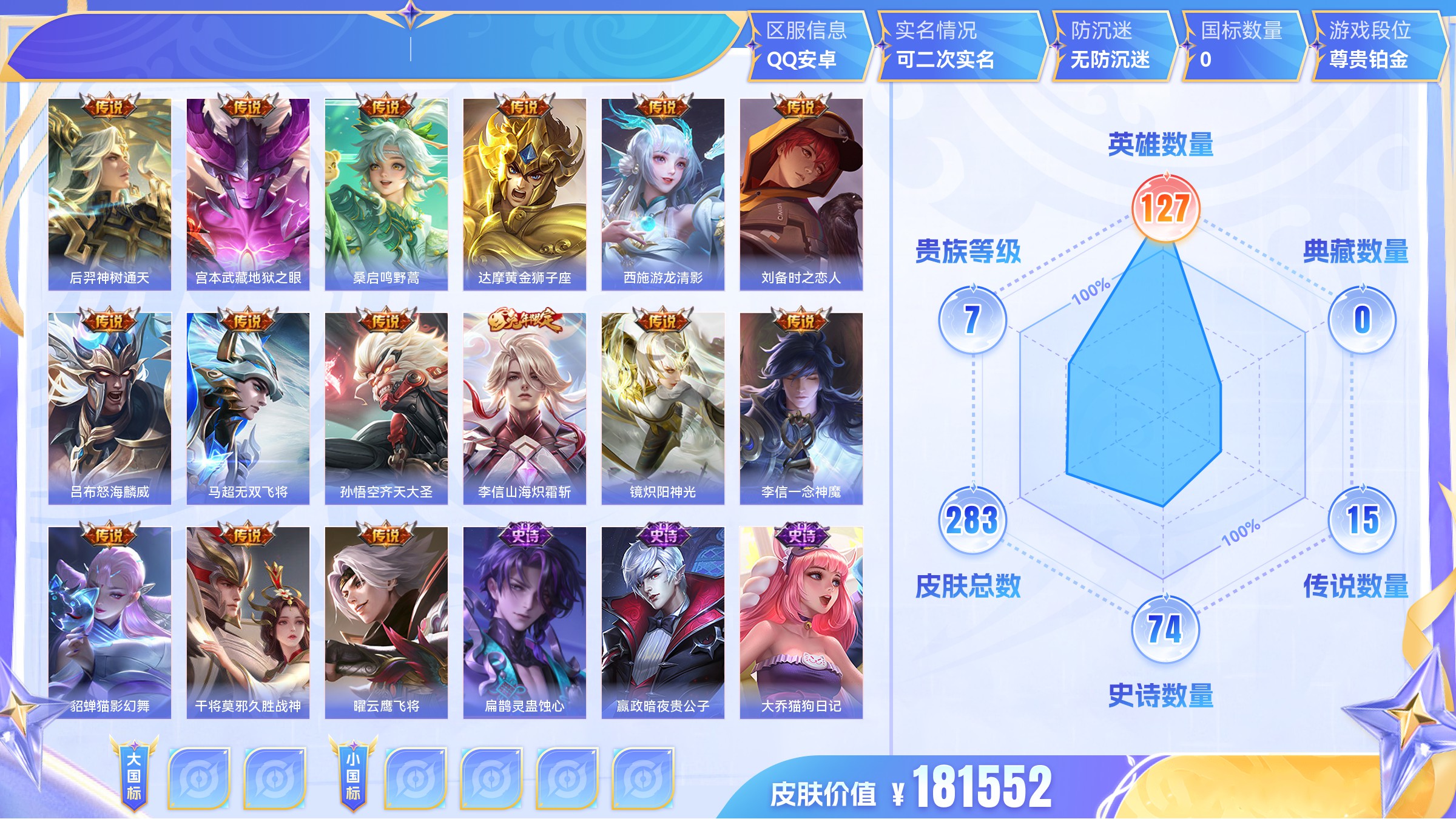 安卓Q-V8-最强王者段位-127英雄-230皮肤-2典藏皮肤-15传说-65