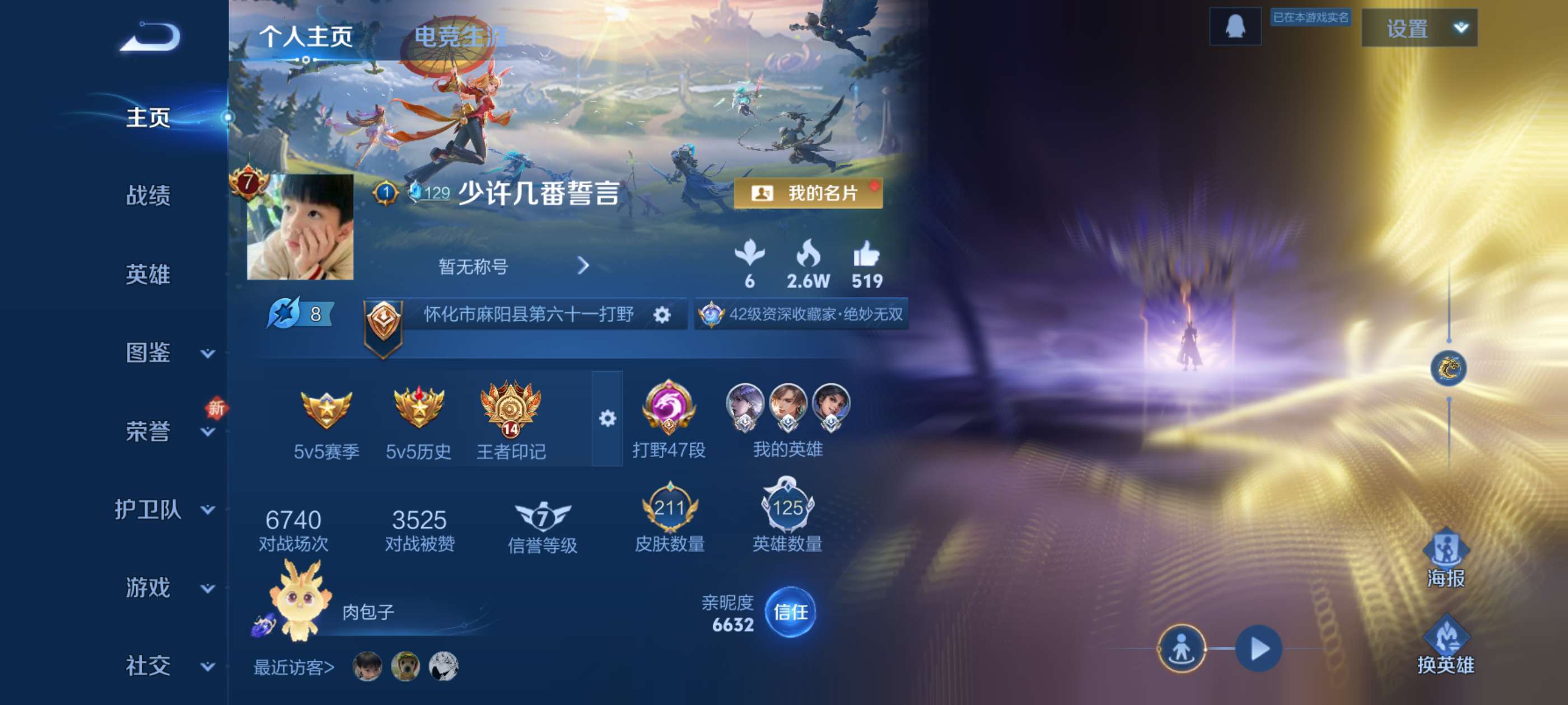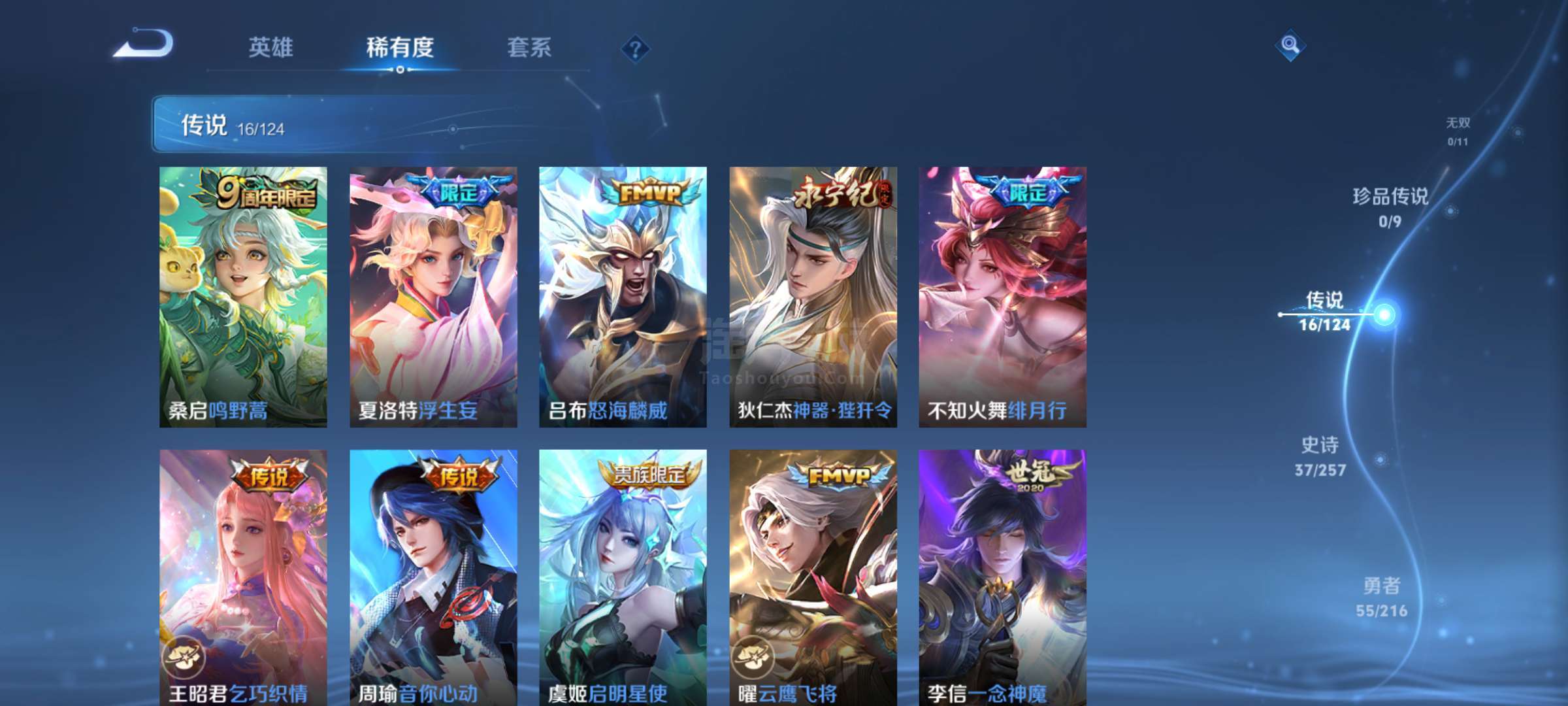 皮肤211 英雄128 非凡王者 荣耀典藏1 无双皮肤1 传说13 其他皮肤73-13个传说47段打