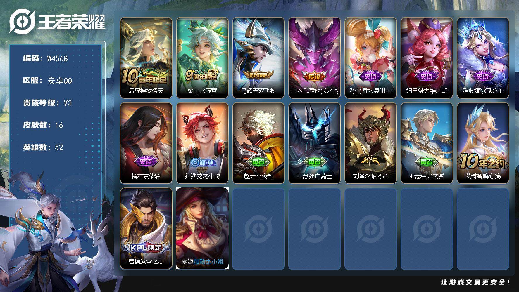 【W4568】安卓Q区-无二次-贵3-52英雄-15皮肤-4传说-4史诗-6限