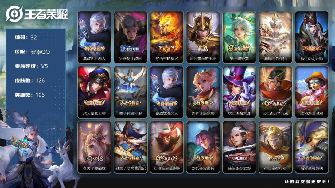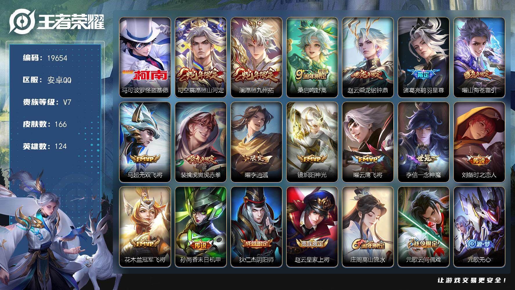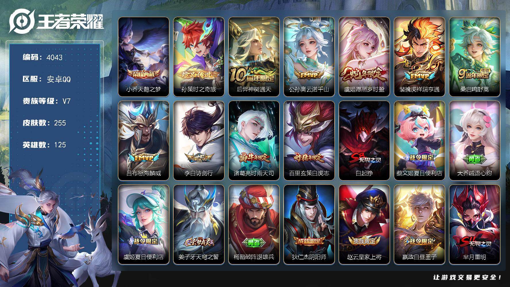 安卓Q-V7-尊贵铂金I段位-125英雄-255皮肤-1典藏皮肤-1珍品传说-