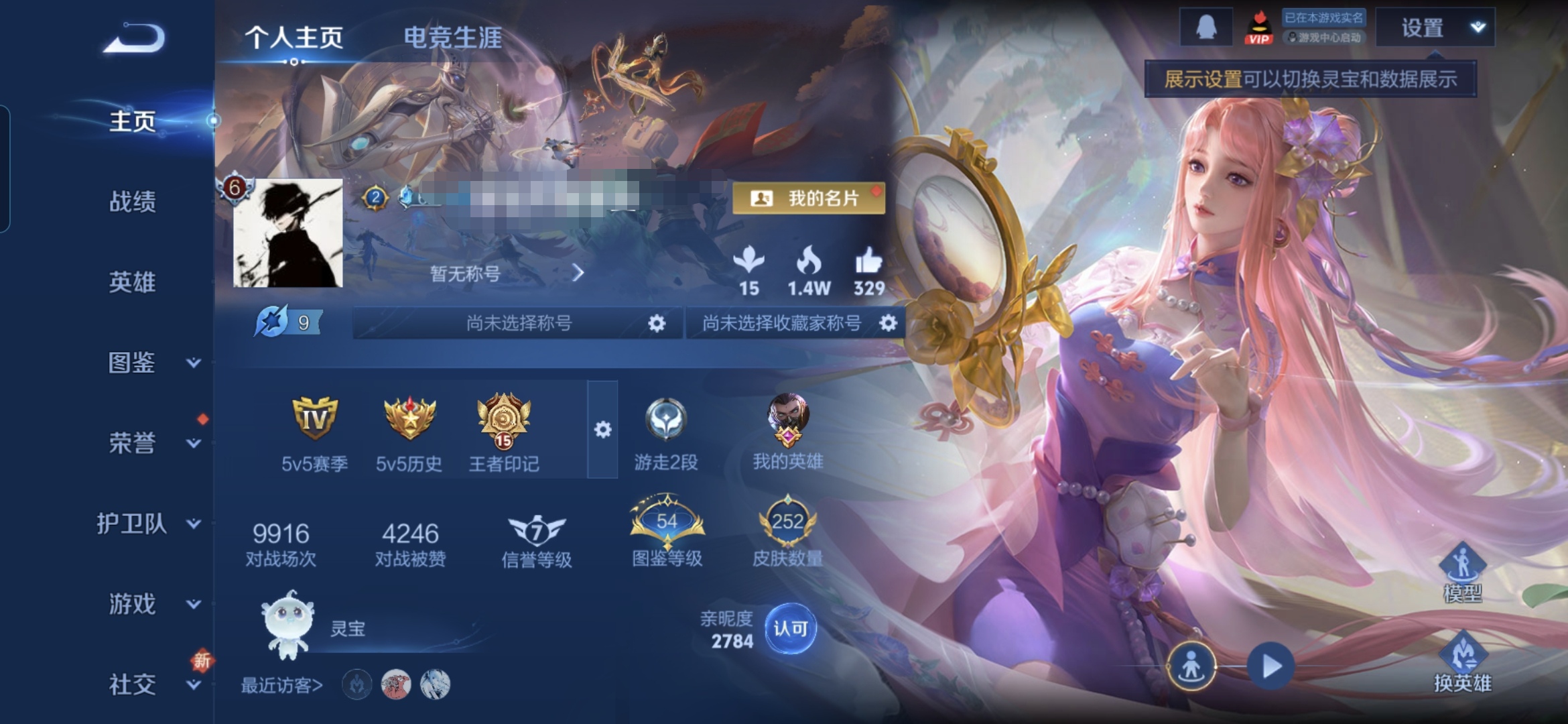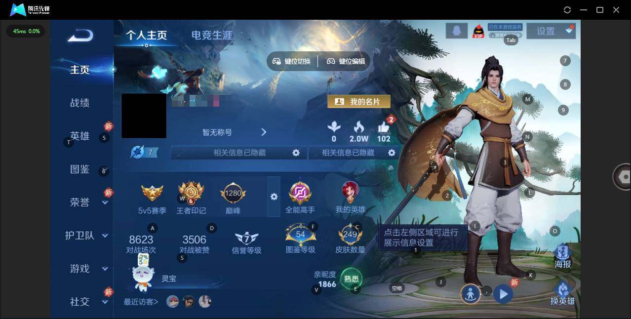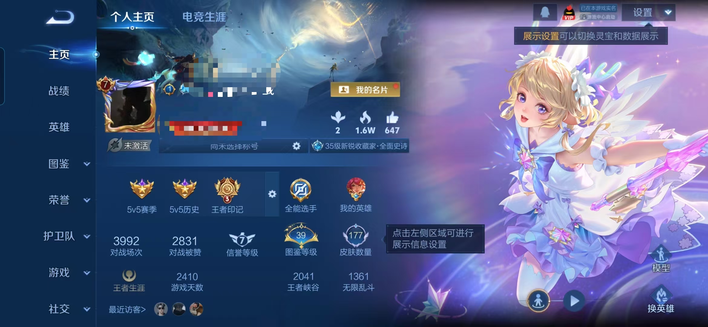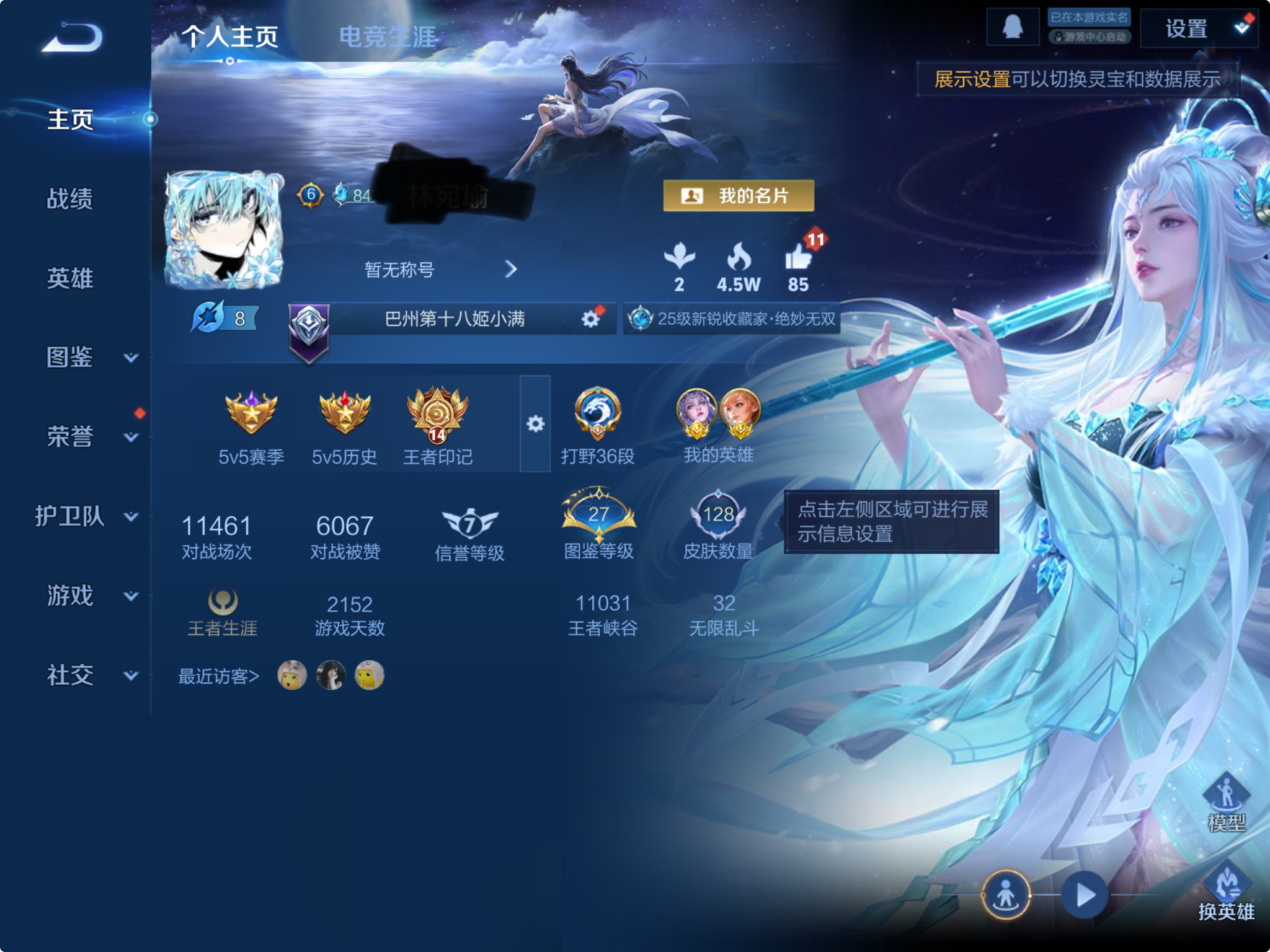 实名: 可修改 贵族等级: V7 英雄数: 128 皮肤数: 249 荣耀水晶