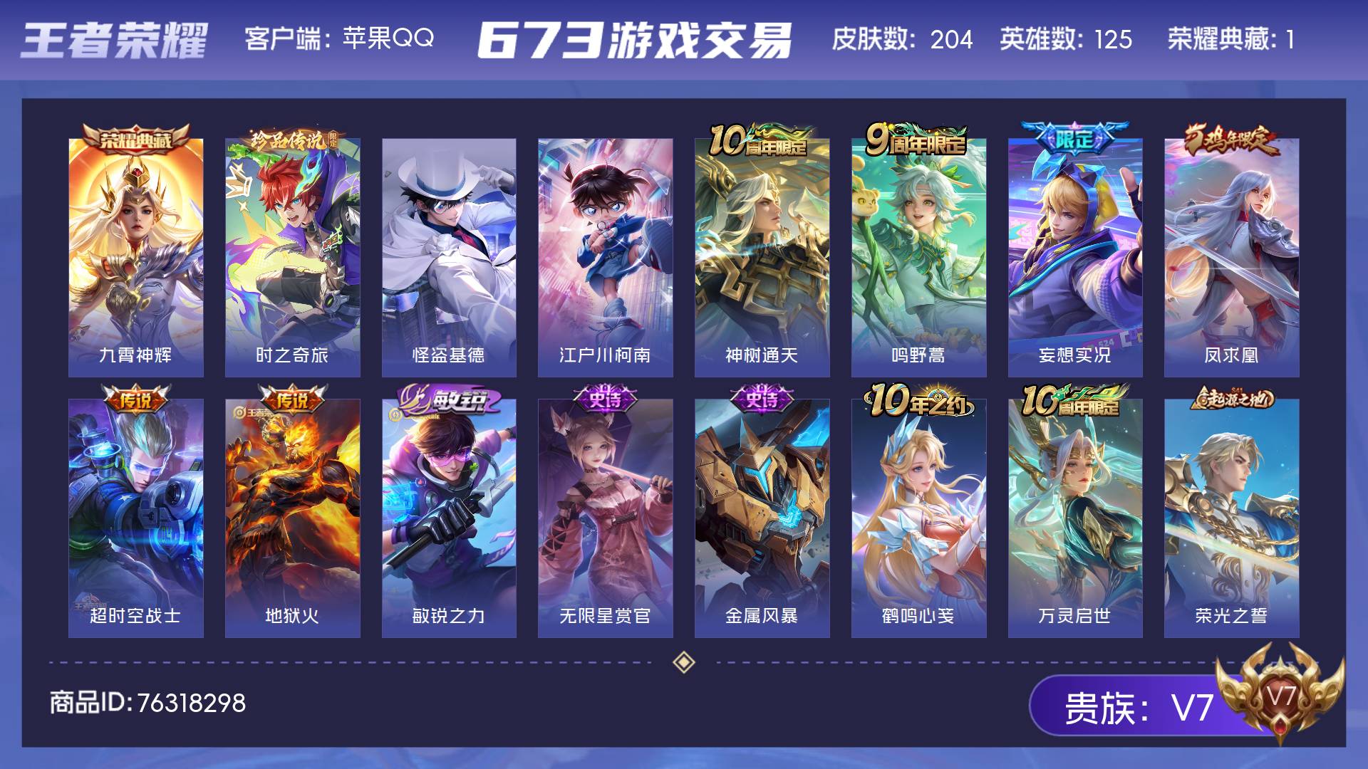 V7 皮肤204 英雄125 至尊星耀 荣耀典藏1 珍品传说3 传说6