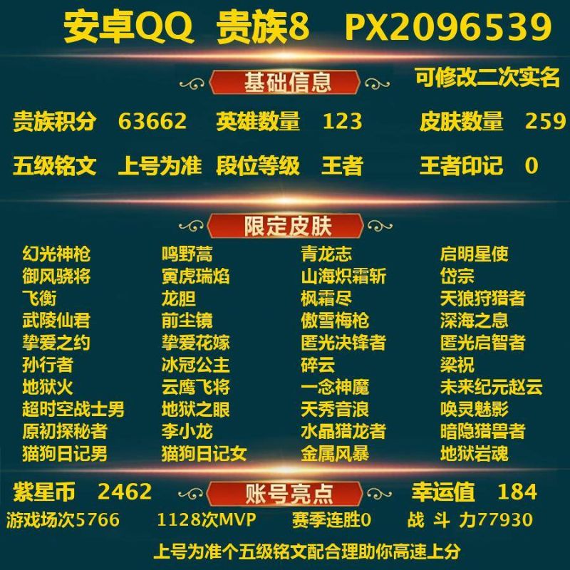 安卓QQ/至尊星耀/195皮肤/122英雄/1典藏/0珍品
